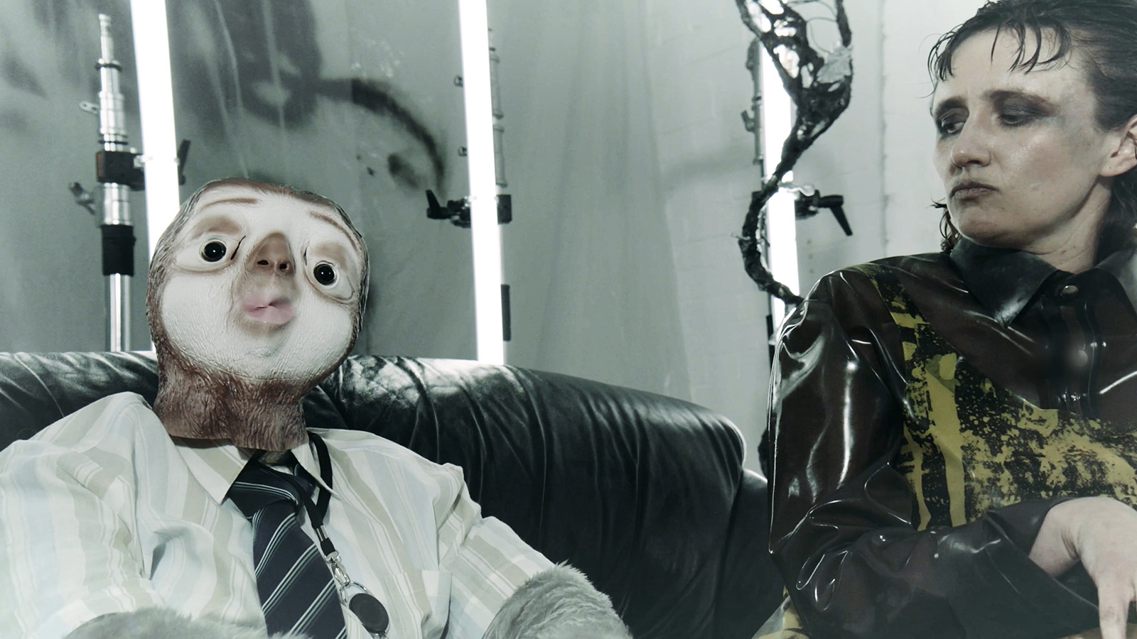 Inside a cave, a decaying skeleton is deep in conversation with a strange looking robot with visible gears in its head, dressed in activewear. “Submit to the singularity”. It goes black and “The sound of something unnecessary intensifies”. PVC clad women in a streaming studio sit between a man in an animal mask: “I love you, but what foxhole are you running?” One of them demands as he then climbs into a box.