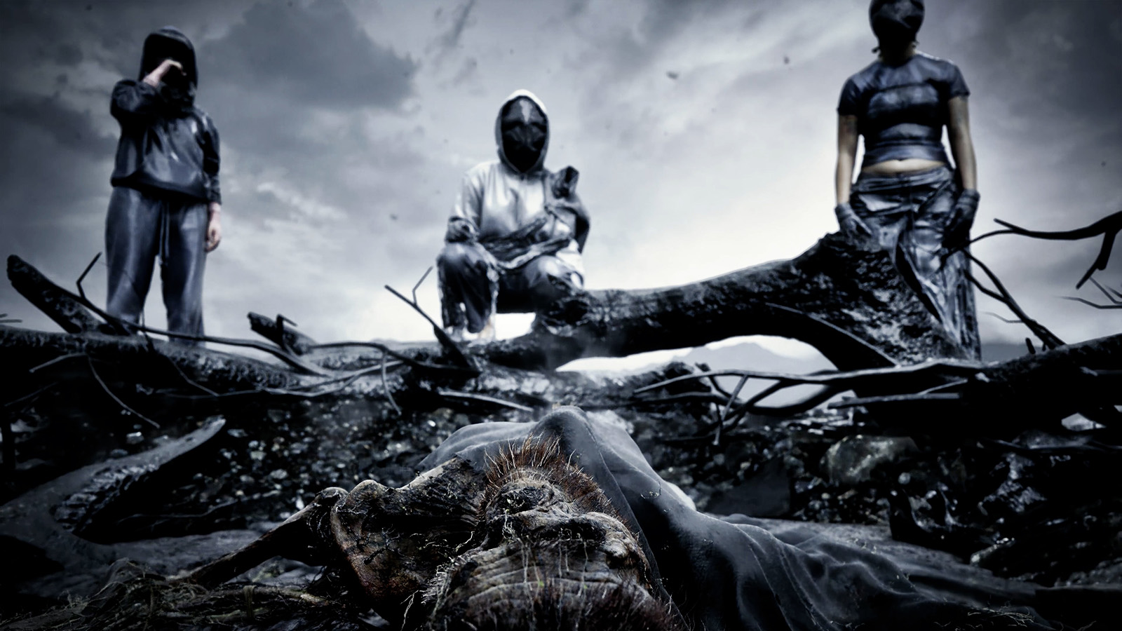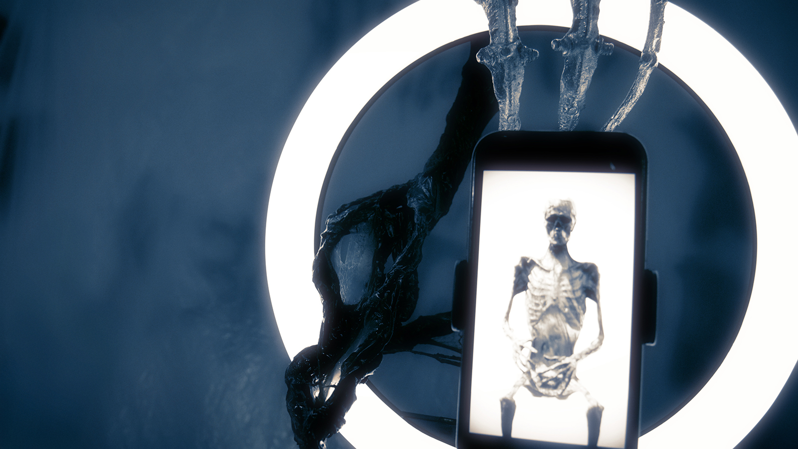 “Go to your cell, your cell will teach you everything”. The livestream of a man in a rabbit mask segues into a manic preacher in a decaying cloth mask in a darkened room, frantically delivering a sermon. We zoom out again as the original skeleton, a bog body, traverses a harsh but beautiful natural landscape across cliffs and hillside to the sound of discordant guitar. This loops back to the beginning. Where are we?