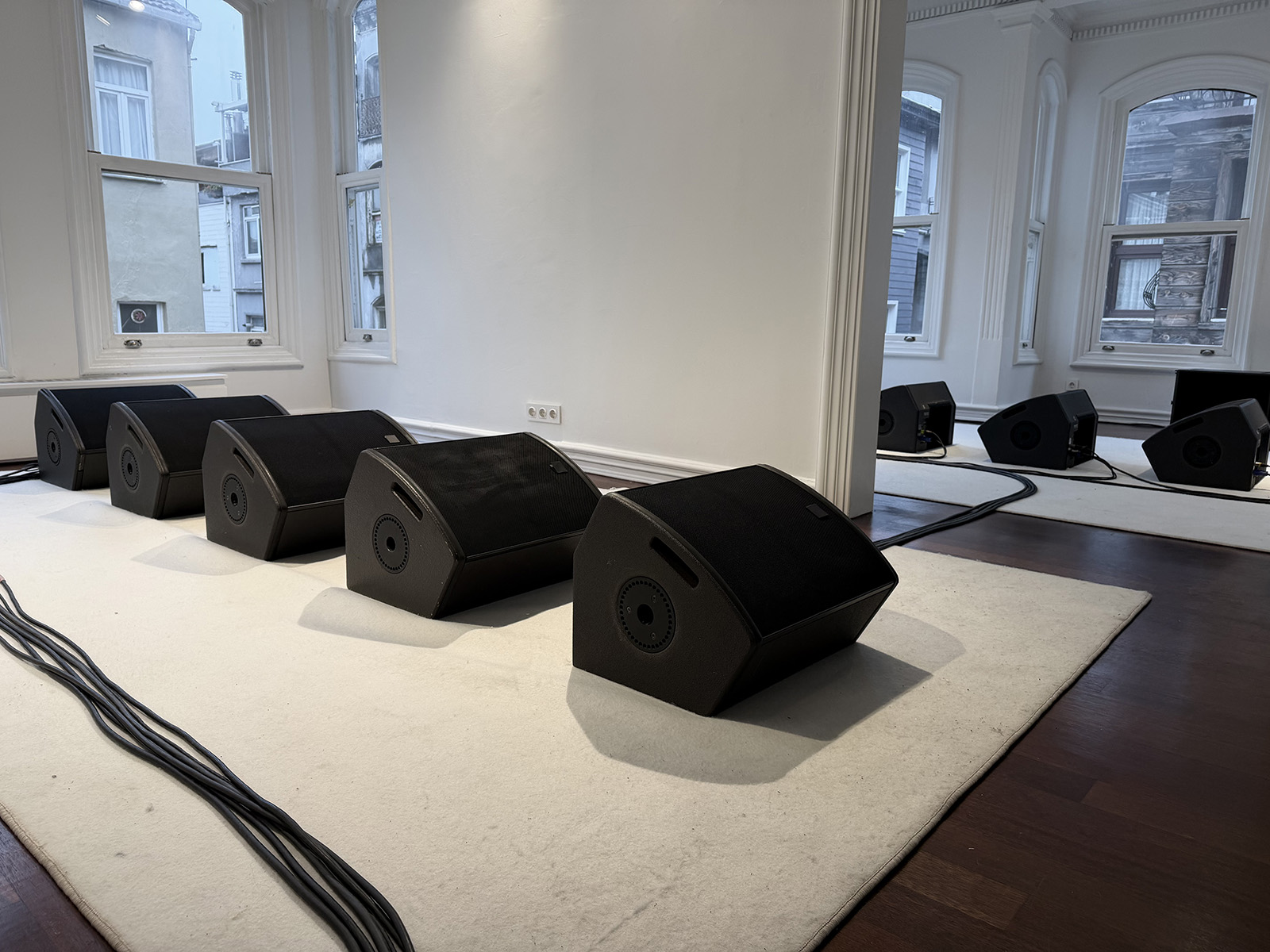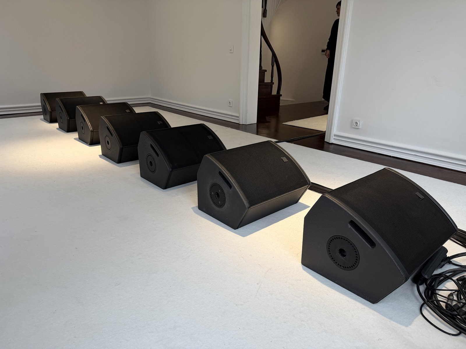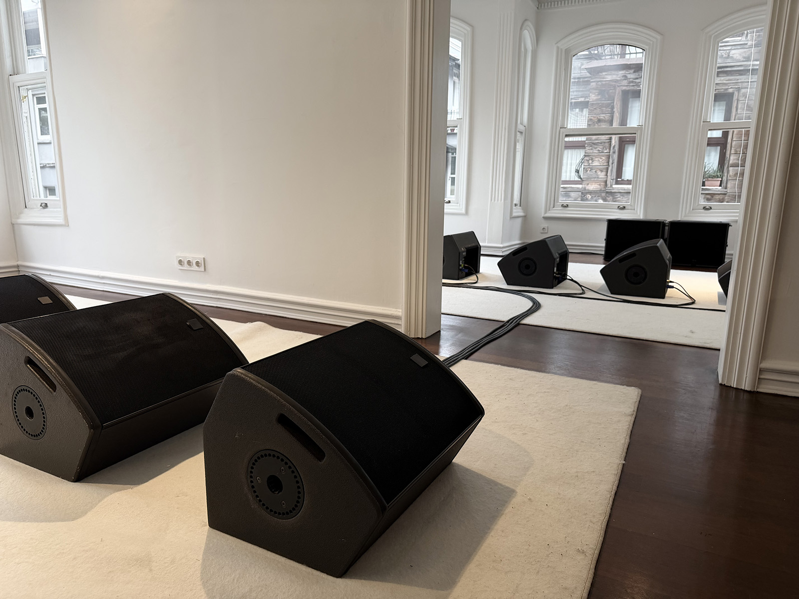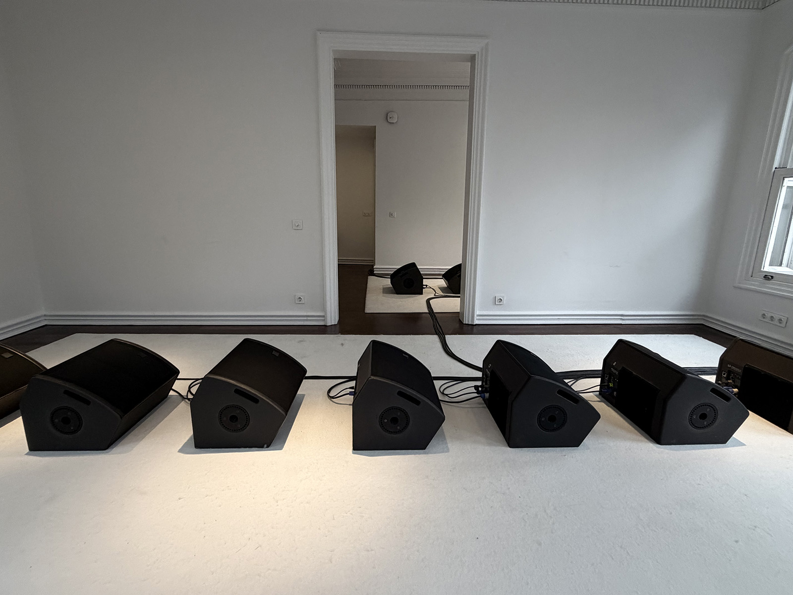 Each room contains a variable number of foldback monitors angled toward an absent performer, as if awaiting someone who will never return. Their clangs travel through a space immersed in bourgeois whiteness: an impassive candour that makes it impossible for sound to settle into stable alignment. At times, tones from both rooms meet in brief, lucid moments of convergence. At others, they collide in harsh bursts that unsettle the ear and sharpen the room’s tension. Sound becomes a language shaped as much by longing as by interruption, an invisible back and forth in which the only physical connector is a black cable running across the soft industrial felt over which the installation lays on. Its presence marks the path between these estranged bodies and suggests a line of communication that remains fragile yet unbroken.