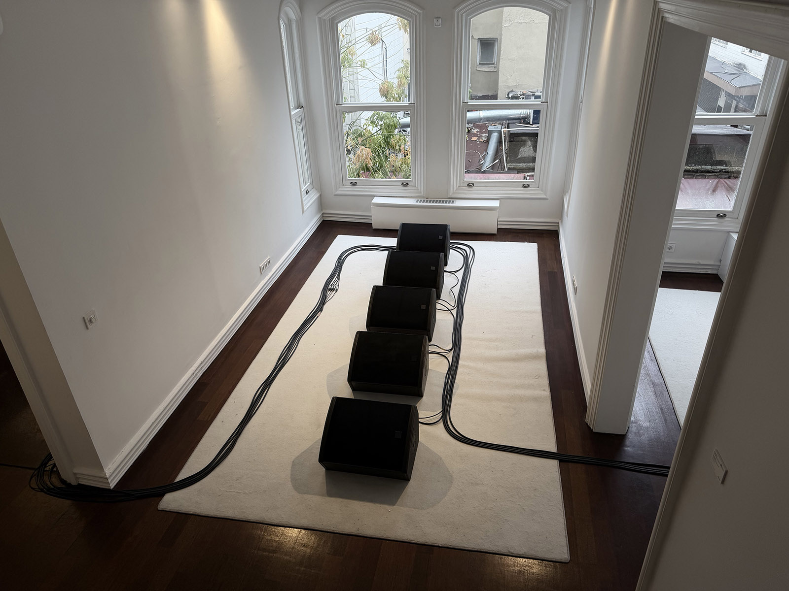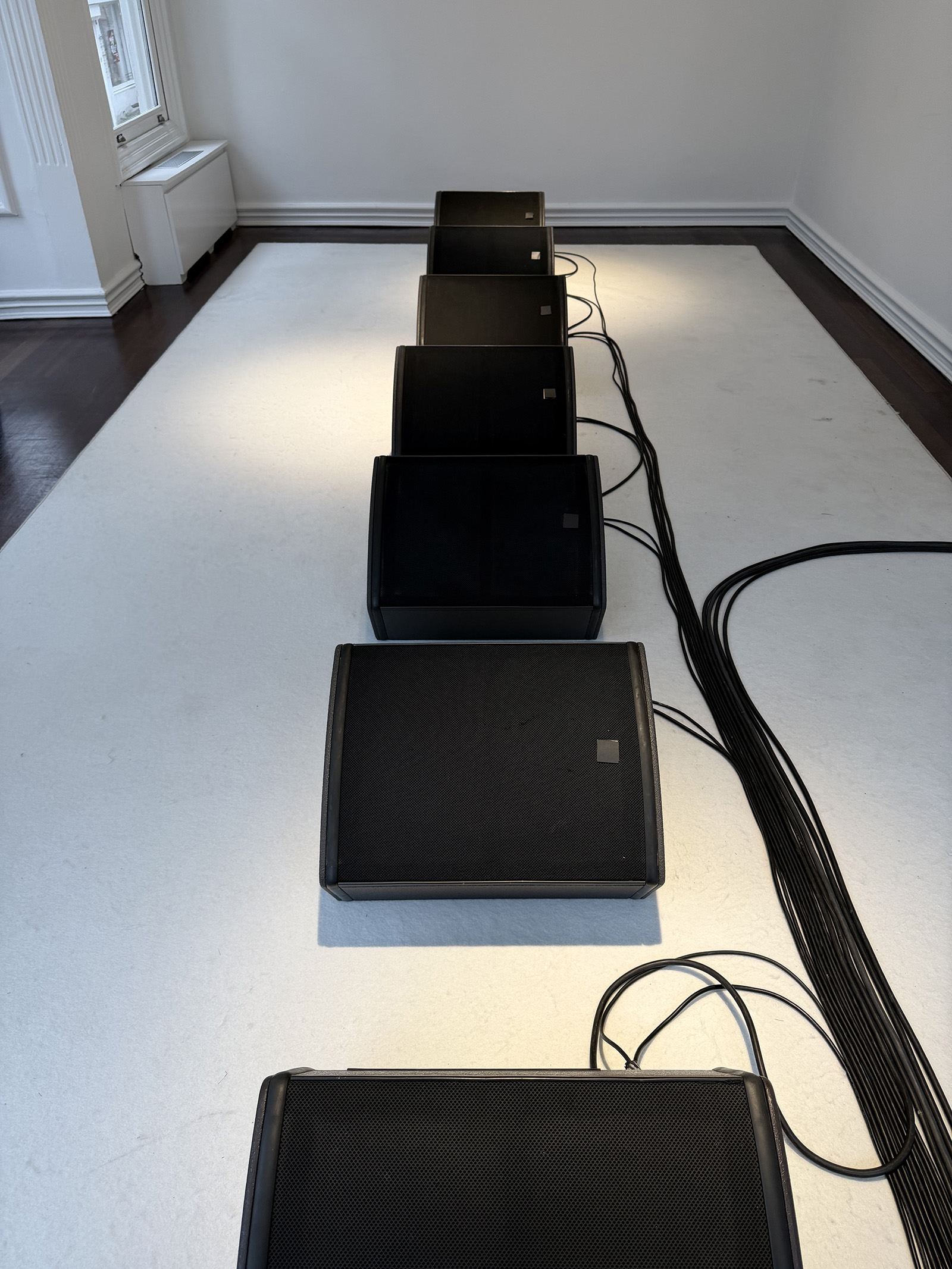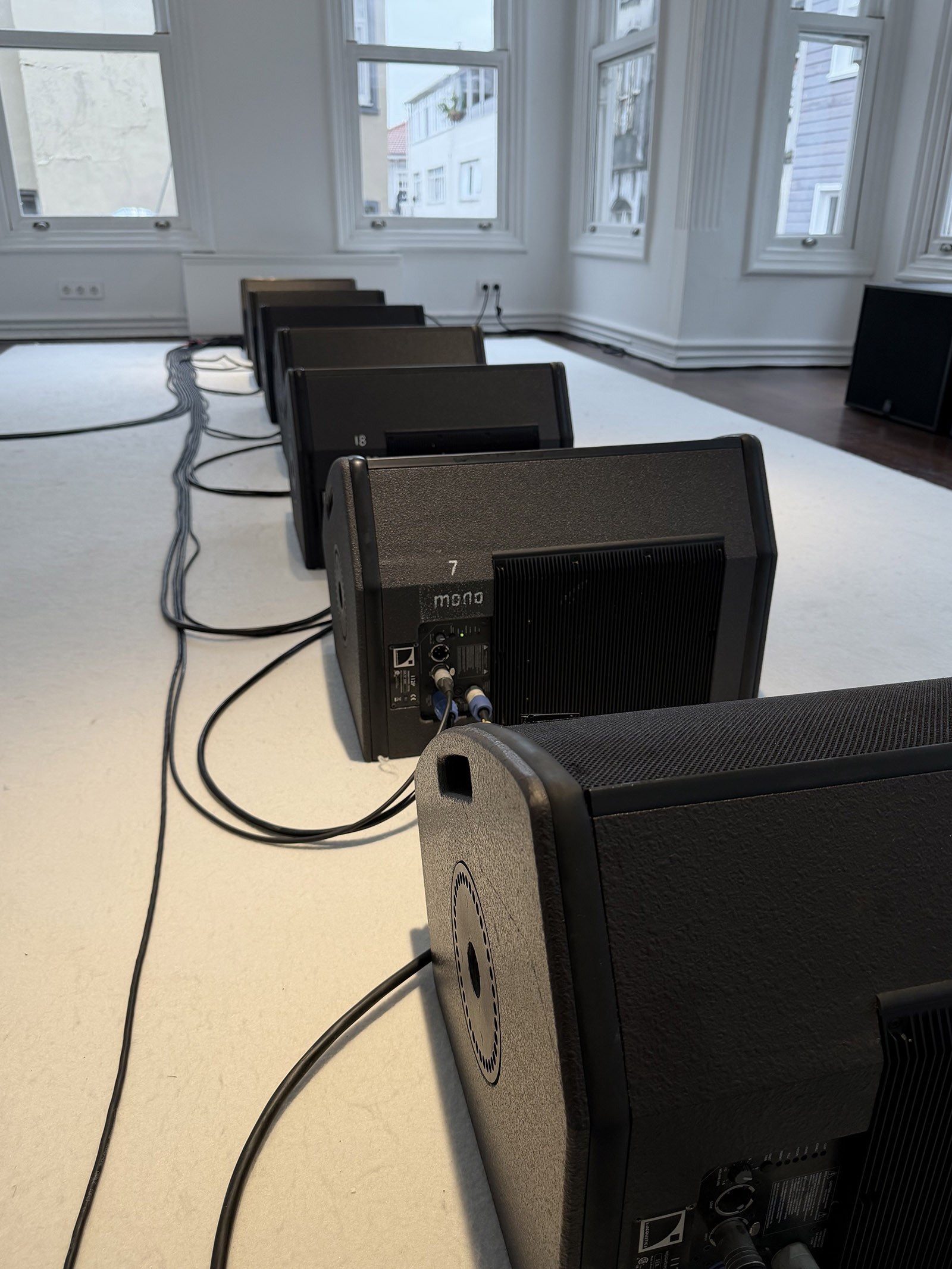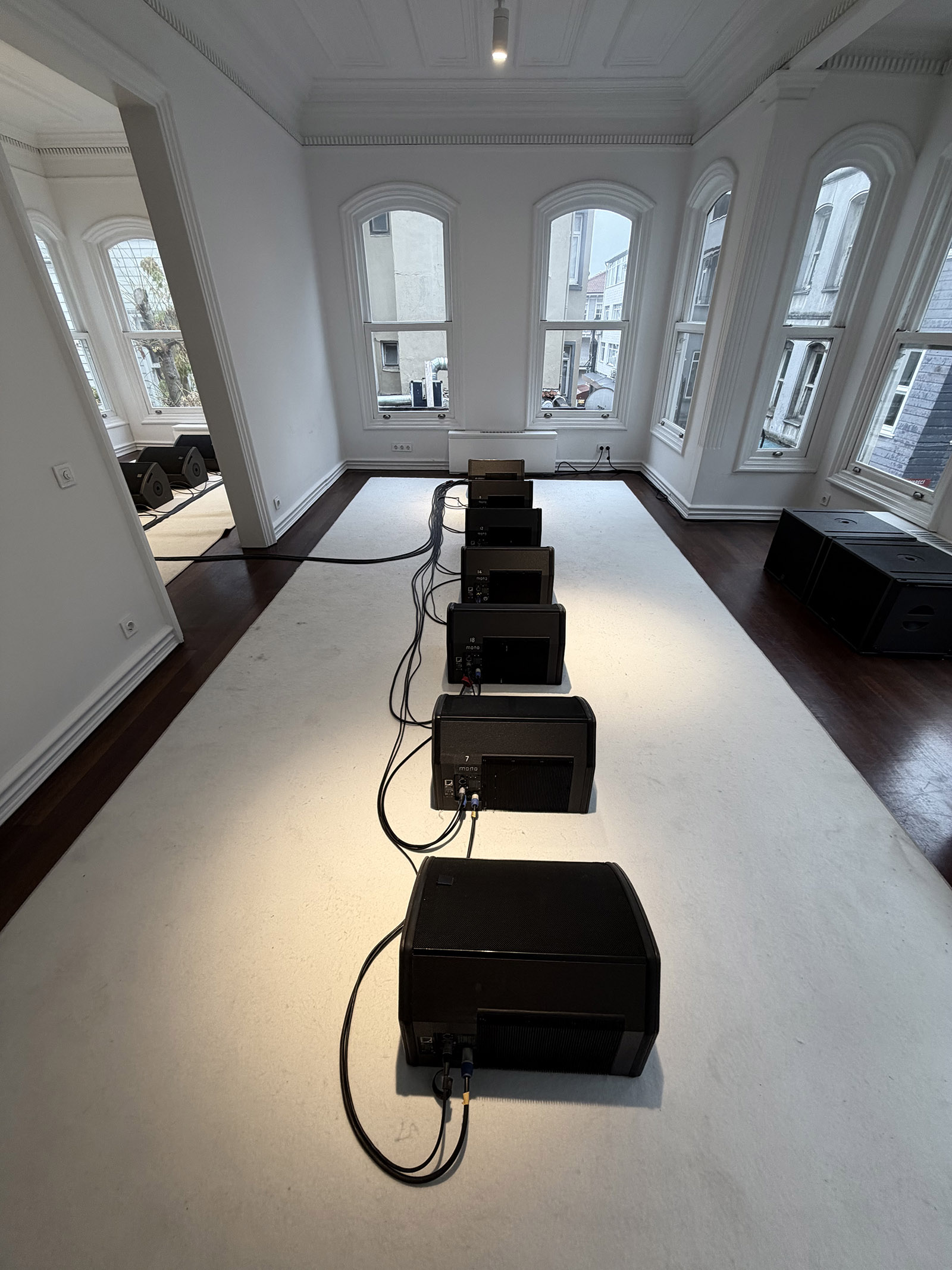 Each room contains a variable number of foldback monitors angled toward an absent performer, as if awaiting someone who will never return. Their clangs travel through a space immersed in bourgeois whiteness: an impassive candour that makes it impossible for sound to settle into stable alignment. At times, tones from both rooms meet in brief, lucid moments of convergence. At others, they collide in harsh bursts that unsettle the ear and sharpen the room’s tension. Sound becomes a language shaped as much by longing as by interruption, an invisible back and forth in which the only physical connector is a black cable running across the soft industrial felt over which the installation lays on. Its presence marks the path between these estranged bodies and suggests a line of communication that remains fragile yet unbroken.