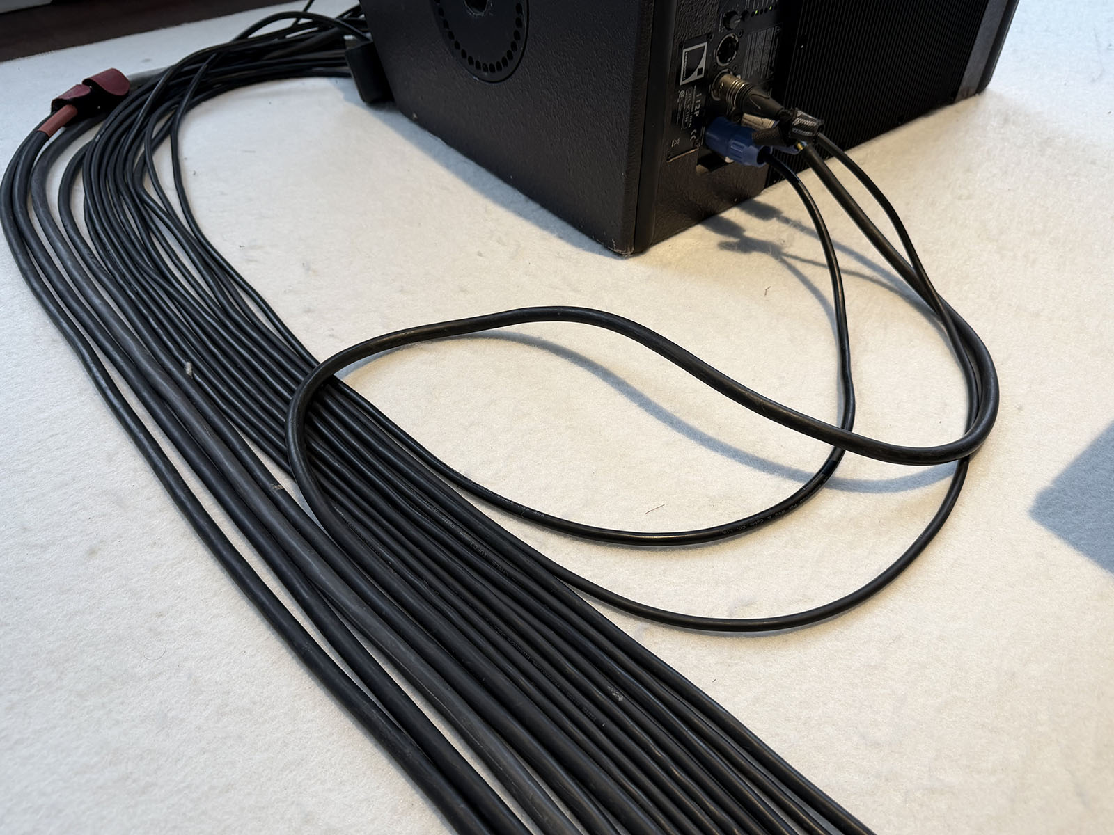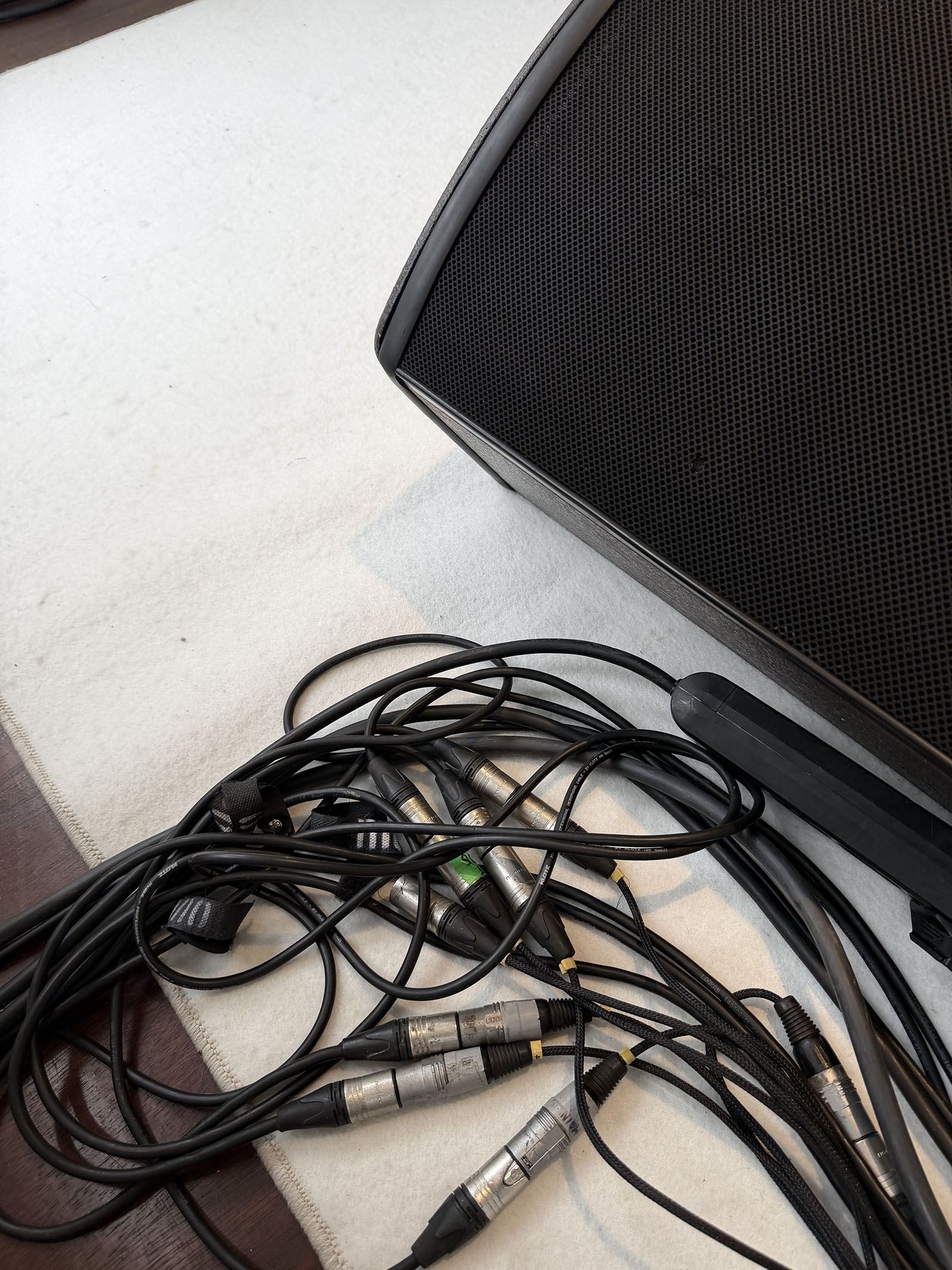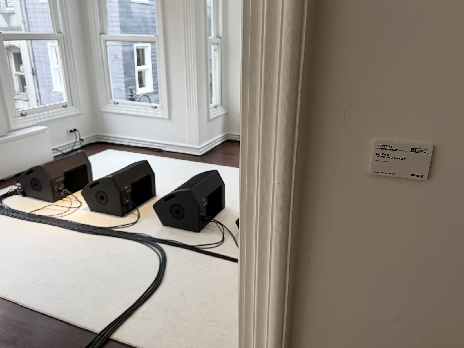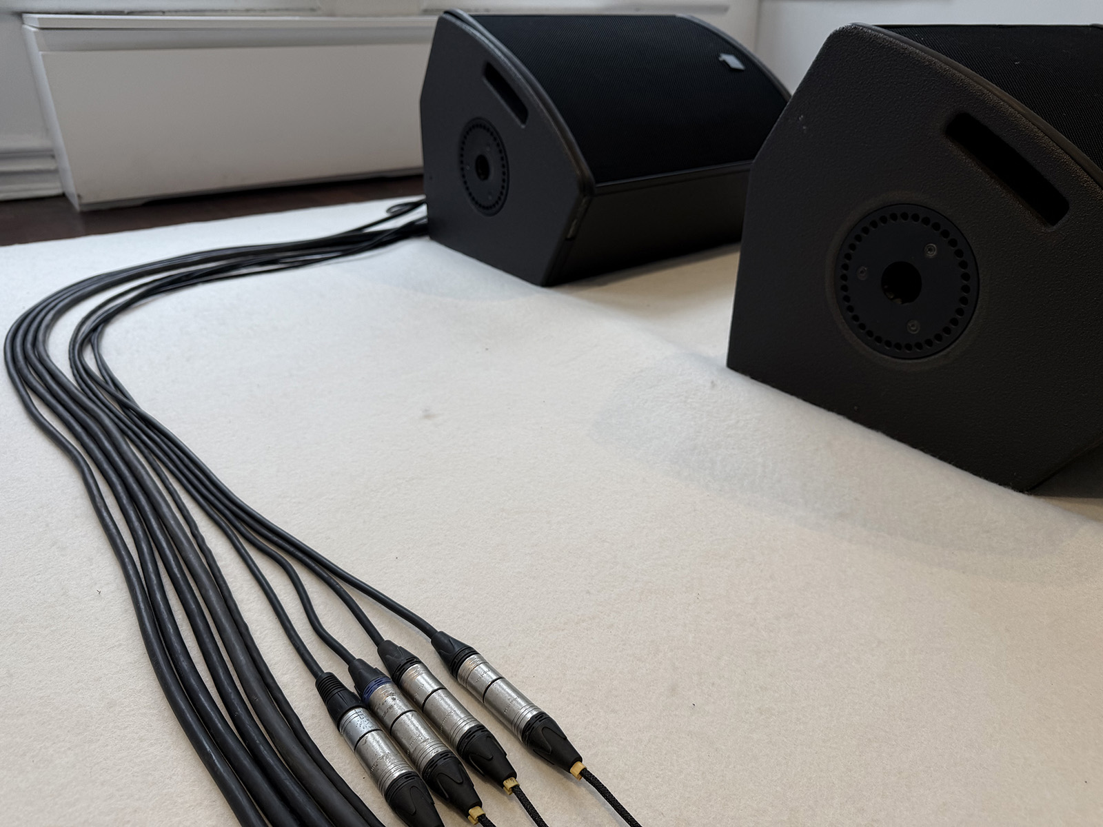 Each room contains a variable number of foldback monitors angled toward an absent performer, as if awaiting someone who will never return. Their clangs travel through a space immersed in bourgeois whiteness: an impassive candour that makes it impossible for sound to settle into stable alignment. At times, tones from both rooms meet in brief, lucid moments of convergence. At others, they collide in harsh bursts that unsettle the ear and sharpen the room’s tension. Sound becomes a language shaped as much by longing as by interruption, an invisible back and forth in which the only physical connector is a black cable running across the soft industrial felt over which the installation lays on. Its presence marks the path between these estranged bodies and suggests a line of communication that remains fragile yet unbroken.