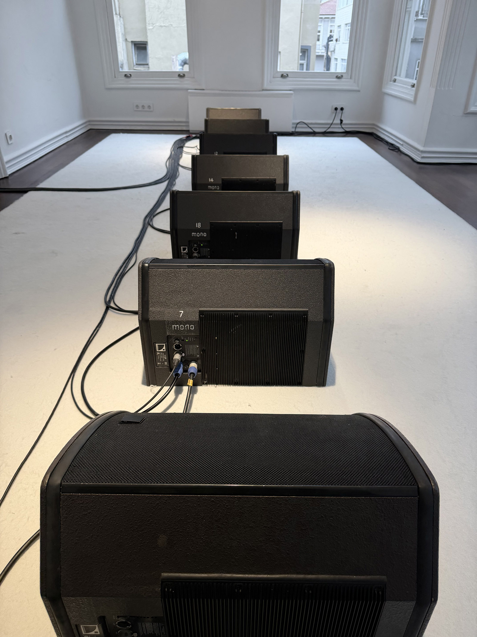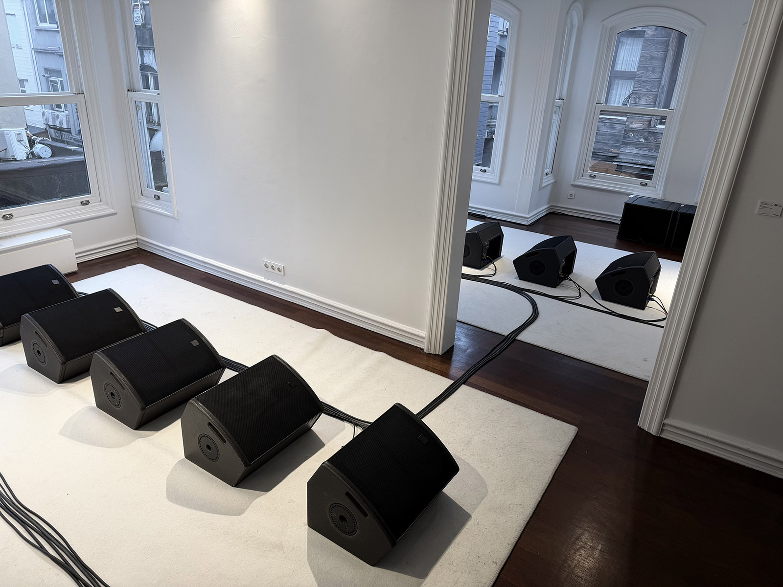 The corridor that links the two rooms intensifies this sense of suspended dialogue. Vibrations shift with every step. Frequencies overlap and dissolve. Melodic traces surface and disappear before they can assert themselves. Walking through this passage feels like moving inside an unresolved conversation. The sound presses against the body, creating an awareness of proximity and absence at the same time. The installation frames the foldback monitors not as machines but as wounded interlocutors that besides carrying the memory of stages, performers, and volume poured into them, now whisper and argue to each other, struggling to bridge a distance that remains stubbornly intact.