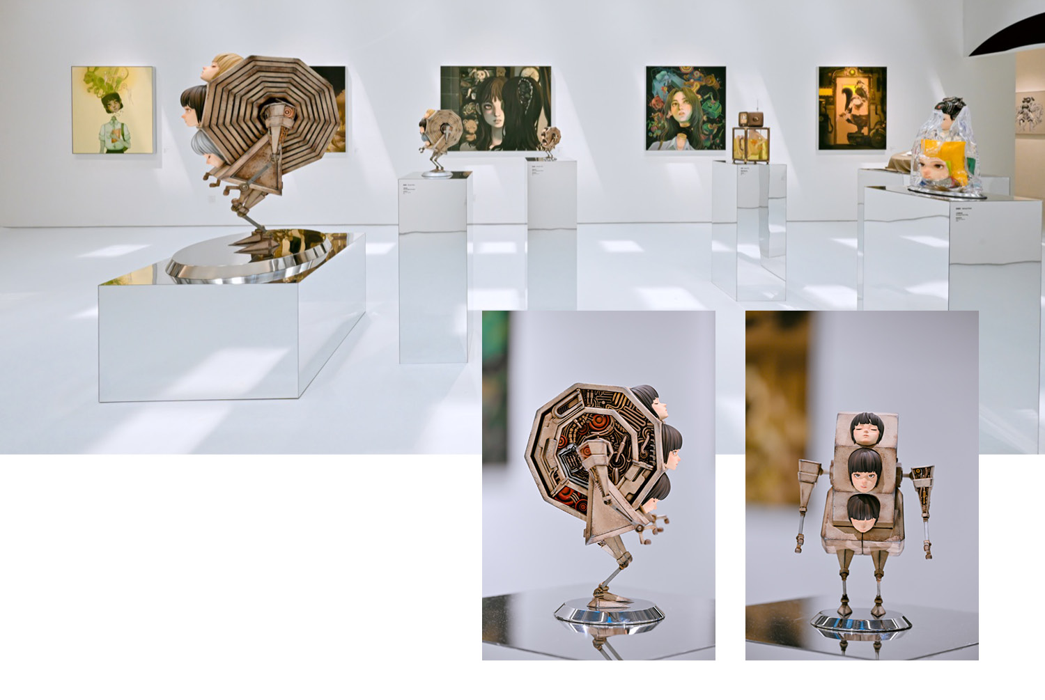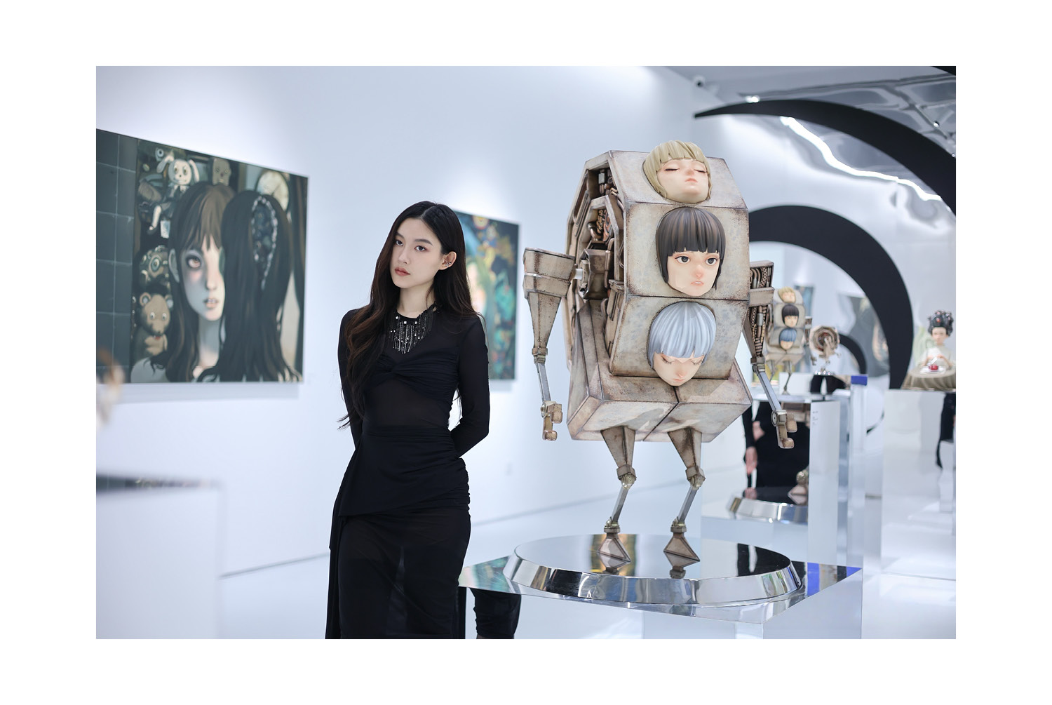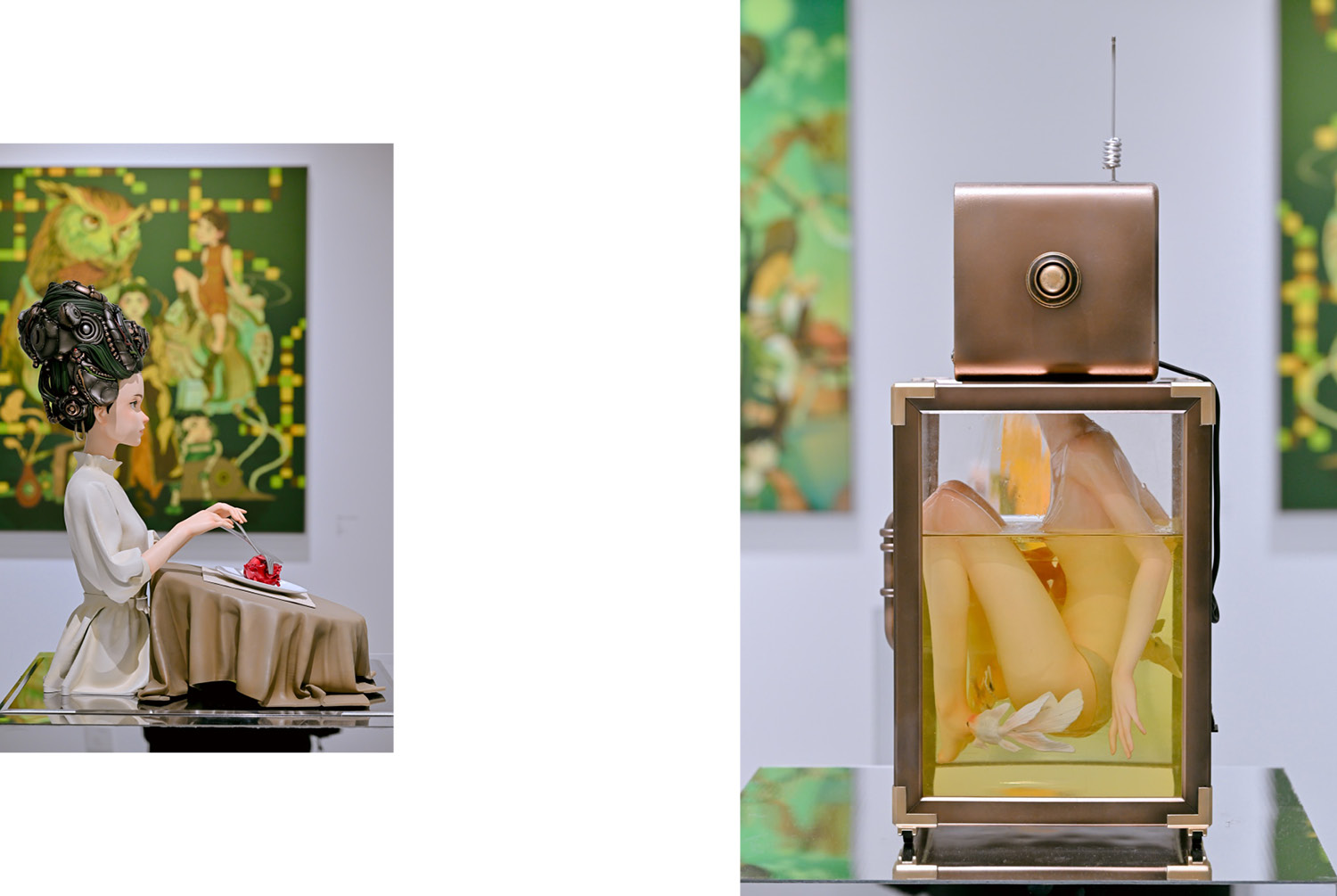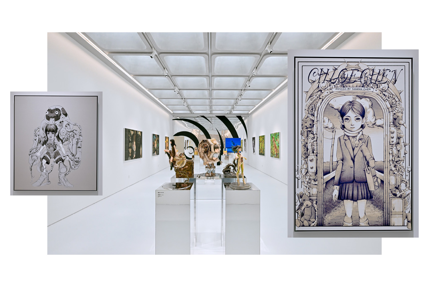 Throughout the exhibition, recurring visual motifs surface like echoes: owls, alarms, clocks, mechanical limbs, emotional symbols, fragments of time and feeling caught in flux. In interviews, Chen has spoken about her fascination with time: how it moves through the body, how it distorts in dreams, under technology, or in the grip of grief. Her work taps into a shared vertigo, the digital overwhelm, the craving for something slower, something real.