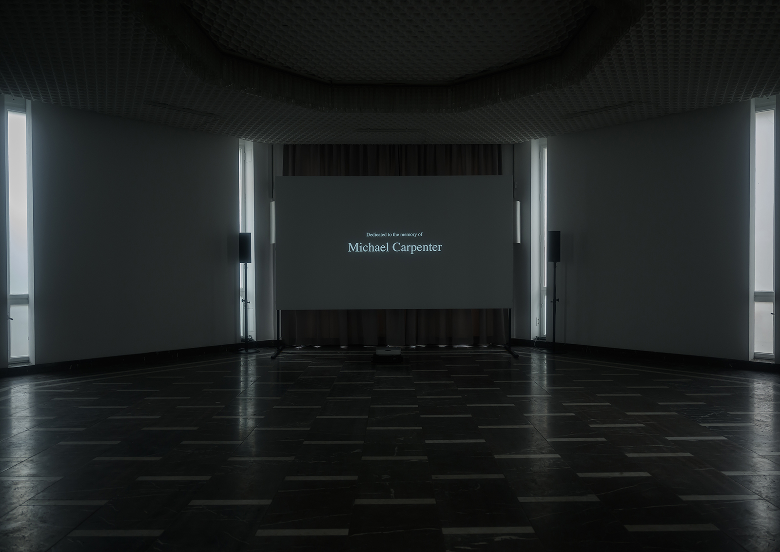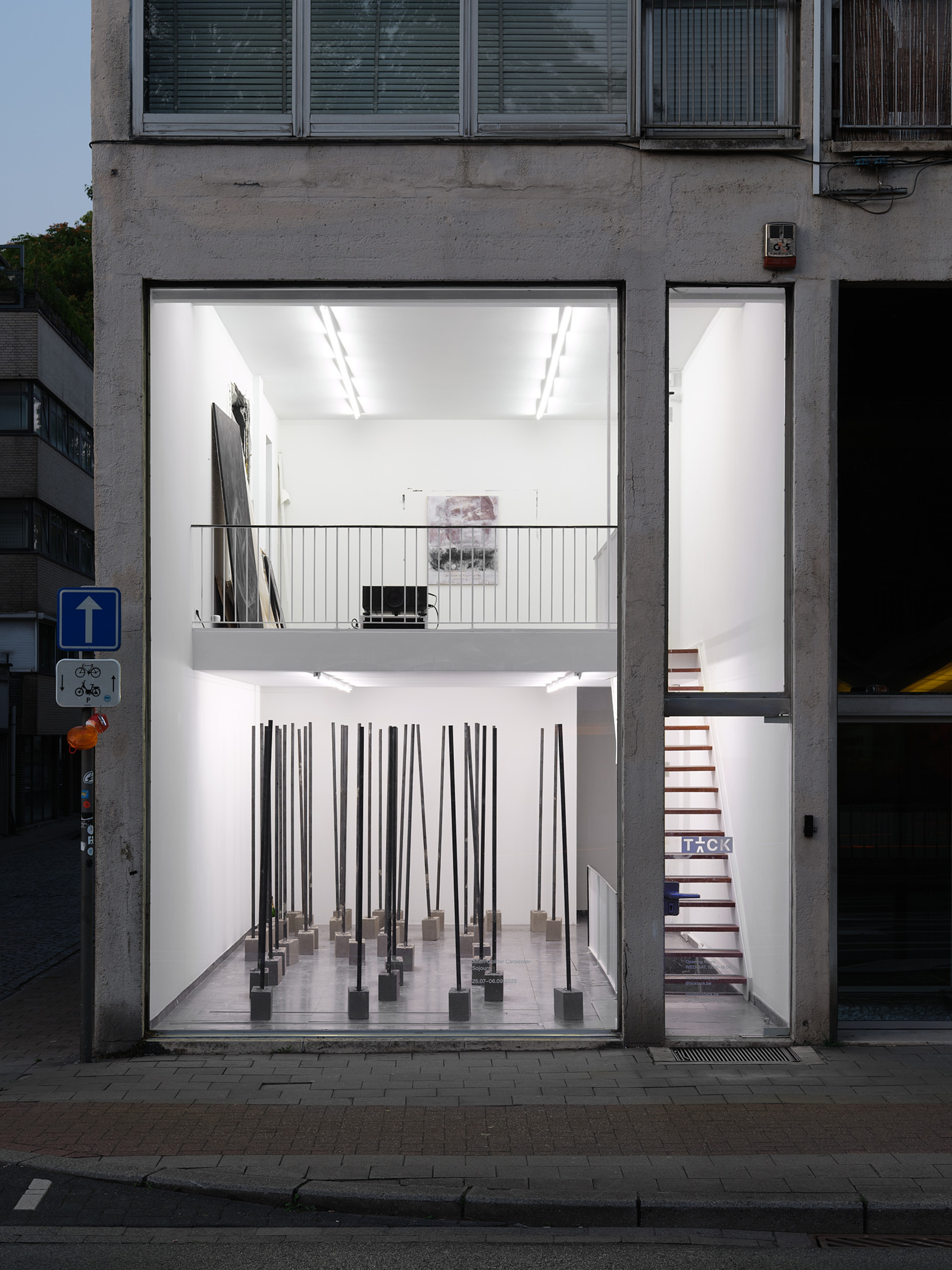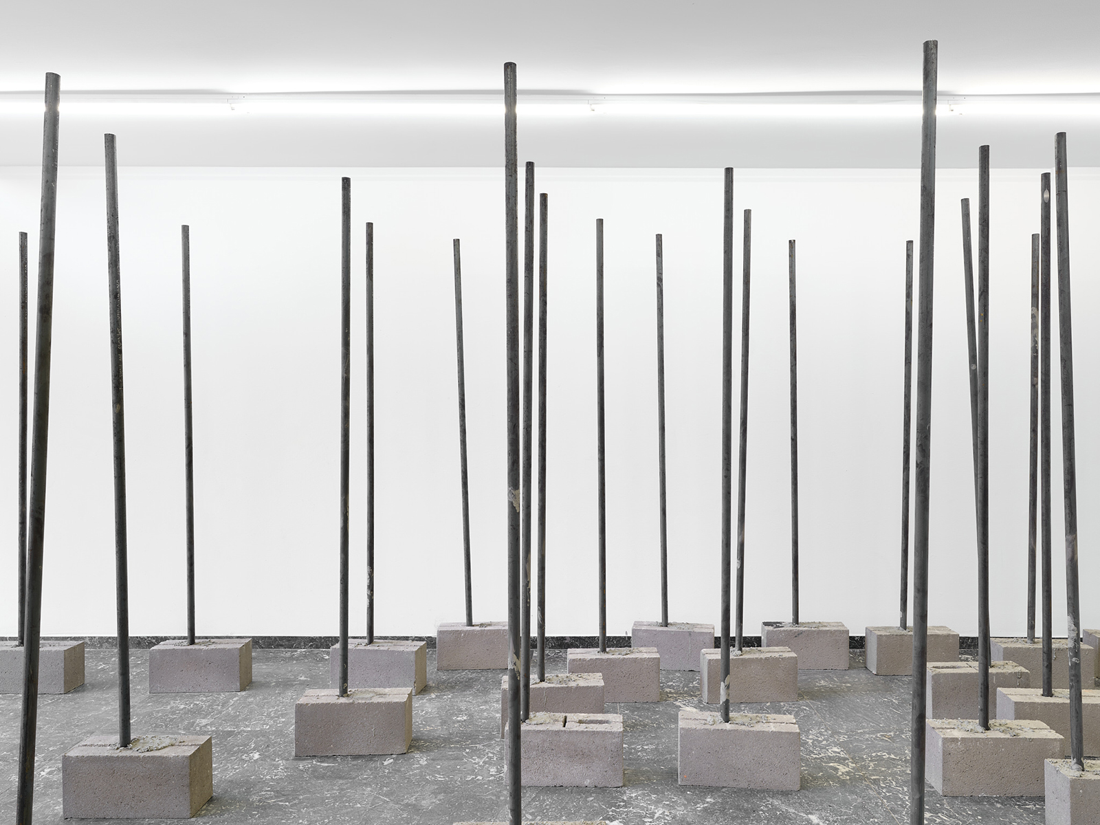 Just before entering TICK TACK Gallery, the viewer can already have a grasp of the exhibition, as one sees it from the street through the wide front window: an evenly distanced mass of metal rods fixed into blocks of grey cement occupying the main room. The concrete has not been smoothed; the rods are slightly off-centre. They seem to lean toward one another, as if unsure of their own function, the only irregularities in this deadly repetition of elements. Their presence is quiet, somehow heroic, as if they had traversed calamities to reach the polished ambient of the gallery. It doesn’t take too long to interpret them as some form of post-apocalyptic menhirs, signaling the presence of a cemetery unmoored from memory. As a matter of fact, the visual origin of this sculptural gesture lies in a scene from the anime Evangelion: 2.0 You Can (Not) Advance, in which the main character encounters his father amid an expansive common graveyard of identical burial indications. Carpenter reframes this cinematic memory as an invitation to distinguish the singularity over the mass, to give attention to the single stories even when they are blurred by the names that history wants to erase.