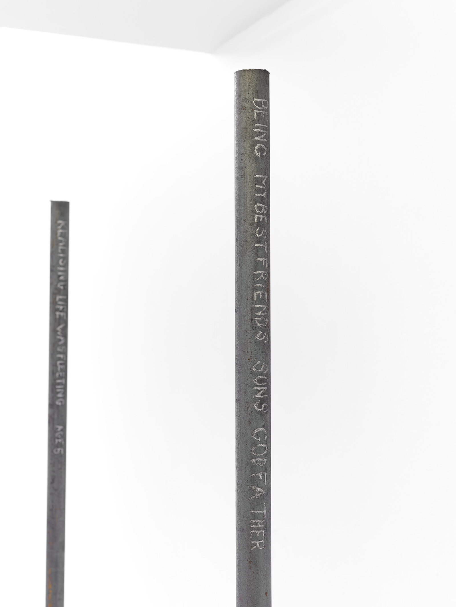 While walking around those rods, one can notice that they have been engraved in the back, in the section that is not immediately visible from the beholder, further inviting the investigation of each single piece. During a guided tour with the artist, we discovered that it’s that precise quote that gives the title to the single work. Those words were selected when Carpenter had asked followers on Instagram to submit fears, lyrics or quotes that were particularly significant to them. These were then etched on the back of each rod, facing away from the entrance, legible only if the viewer circles around with intent. Each one marks a point of connection that exists outside of the artist’s authorship, in the attempt of etching in time and space an exchange of brief lapses of life through social media, the most fleeting form of interaction of our times. Through this lingering air of latency one becomes aware of the slowness of looking, making the act of reading shift towards a form of resistance to time.