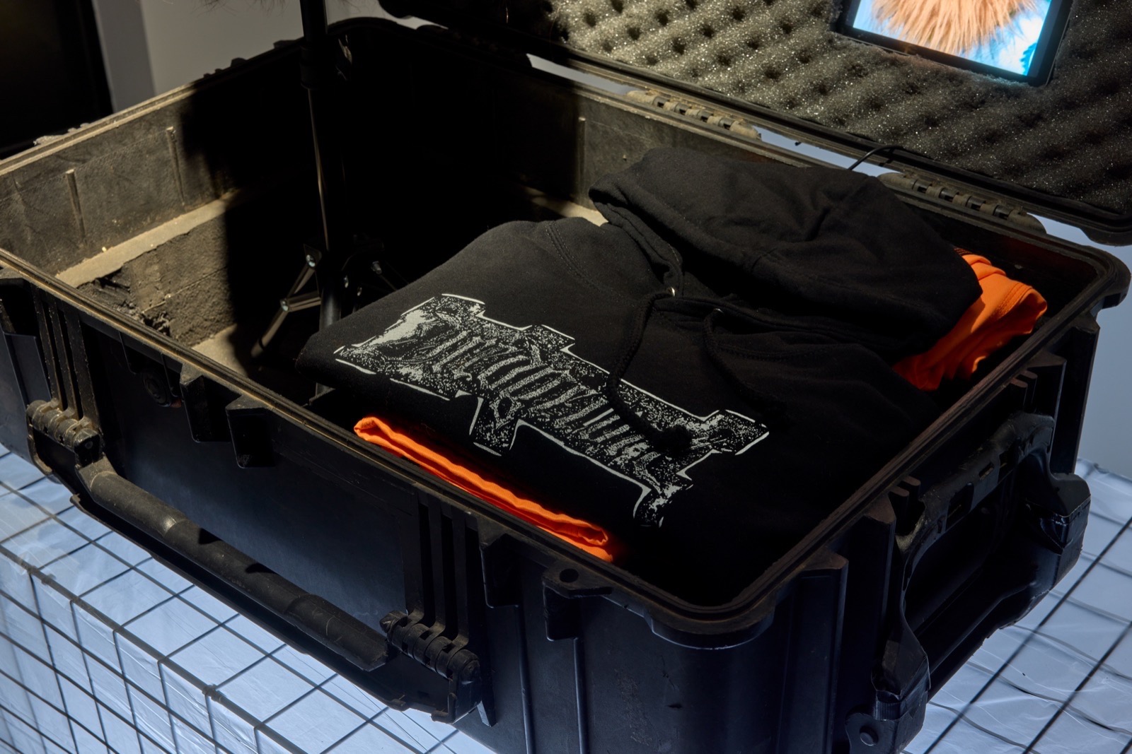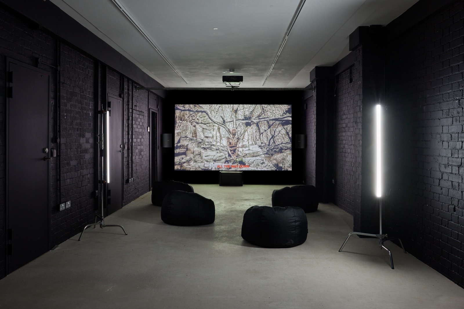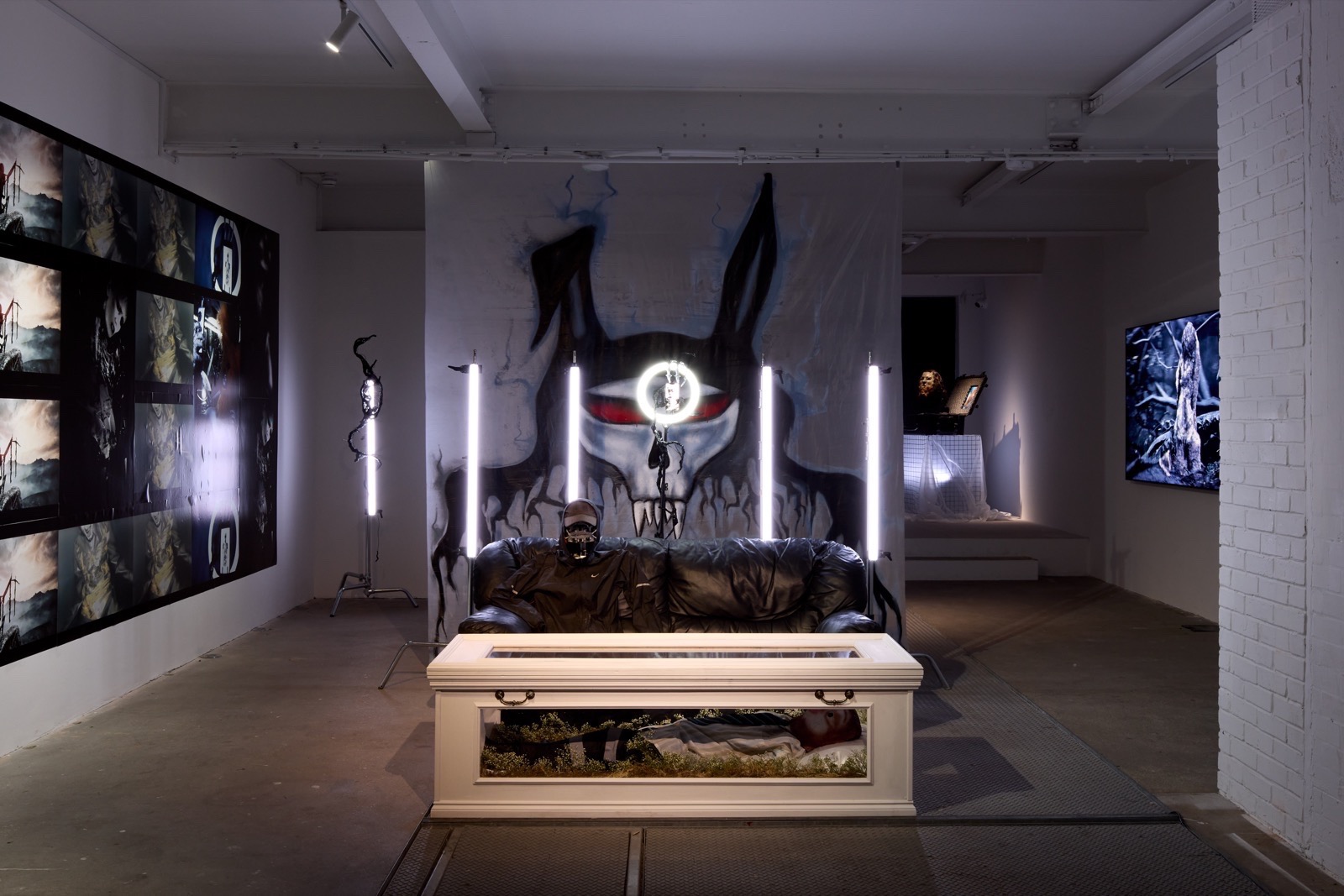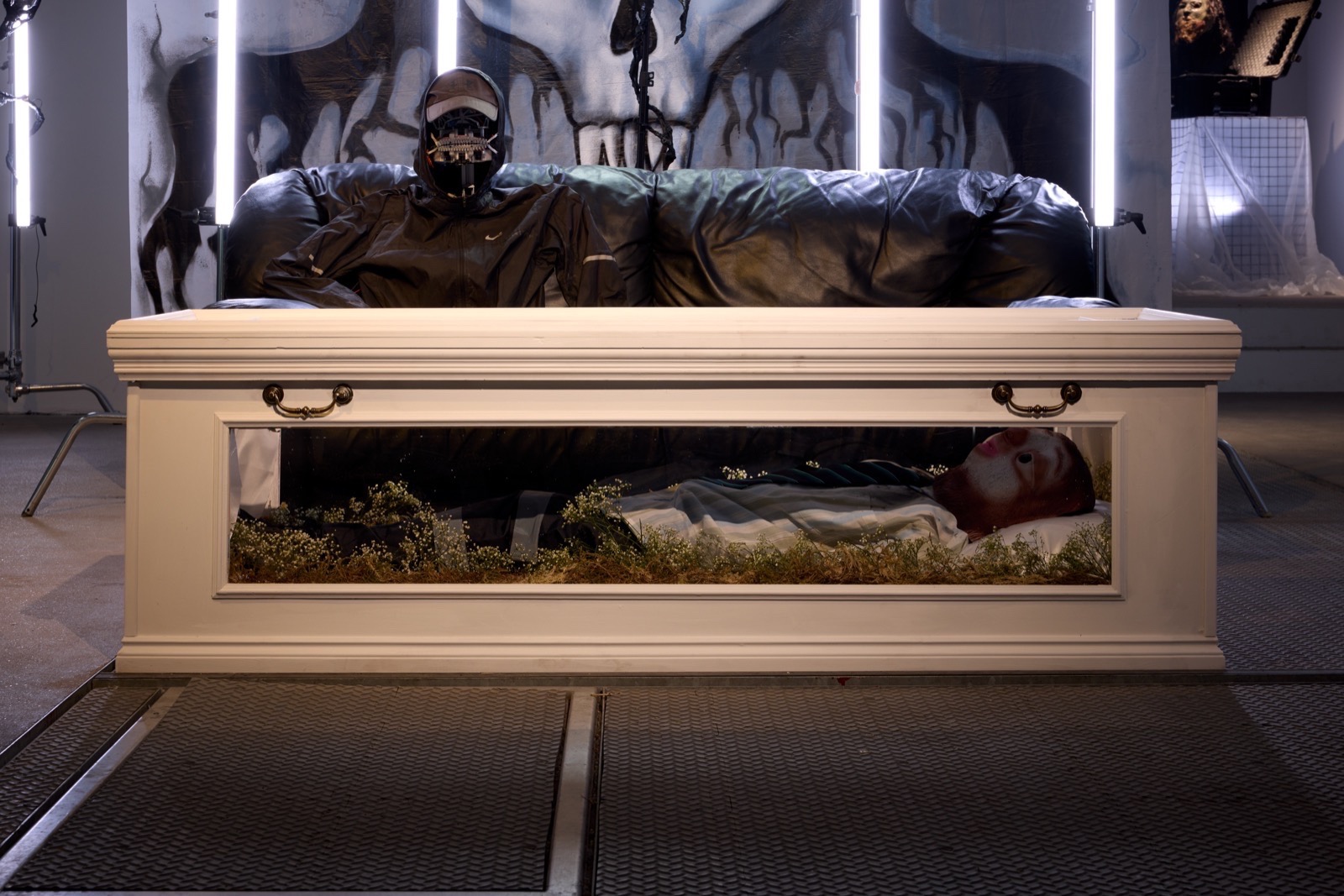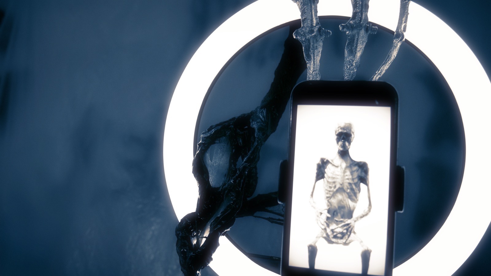 Inside a cave, a decaying skeleton is deep in conversation with a strange looking robot with visible gears in its head, dressed in activewear. “Submit to the singularity”. It goes black and “The sound of something unnecessary intensifies”. PVC clad women in a streaming studio sit between a man in an animal mask: “I love you, but what foxhole are you running?” One of them demands as he then climbs into a box. “Go to your cell, your cell will teach you everything”. The livestream of a man in a rabbit mask segues into a manic preacher in a decaying cloth mask in a darkened room, frantically delivering a sermon. We zoom out again as the original skeleton, a bog body, traverses a harsh but beautiful natural landscape across cliffs and hillside to the sound of discordant guitar. This loops back to the beginning. Where are we? The beauty of this world that’s been created is you can feel your way through it and arrive at your own meaning. The characters from the middle section feels like a cycle of content that’s being made but constantly degrading from some strange source, framed by the skeleton representing humanity being replaced by the robot.