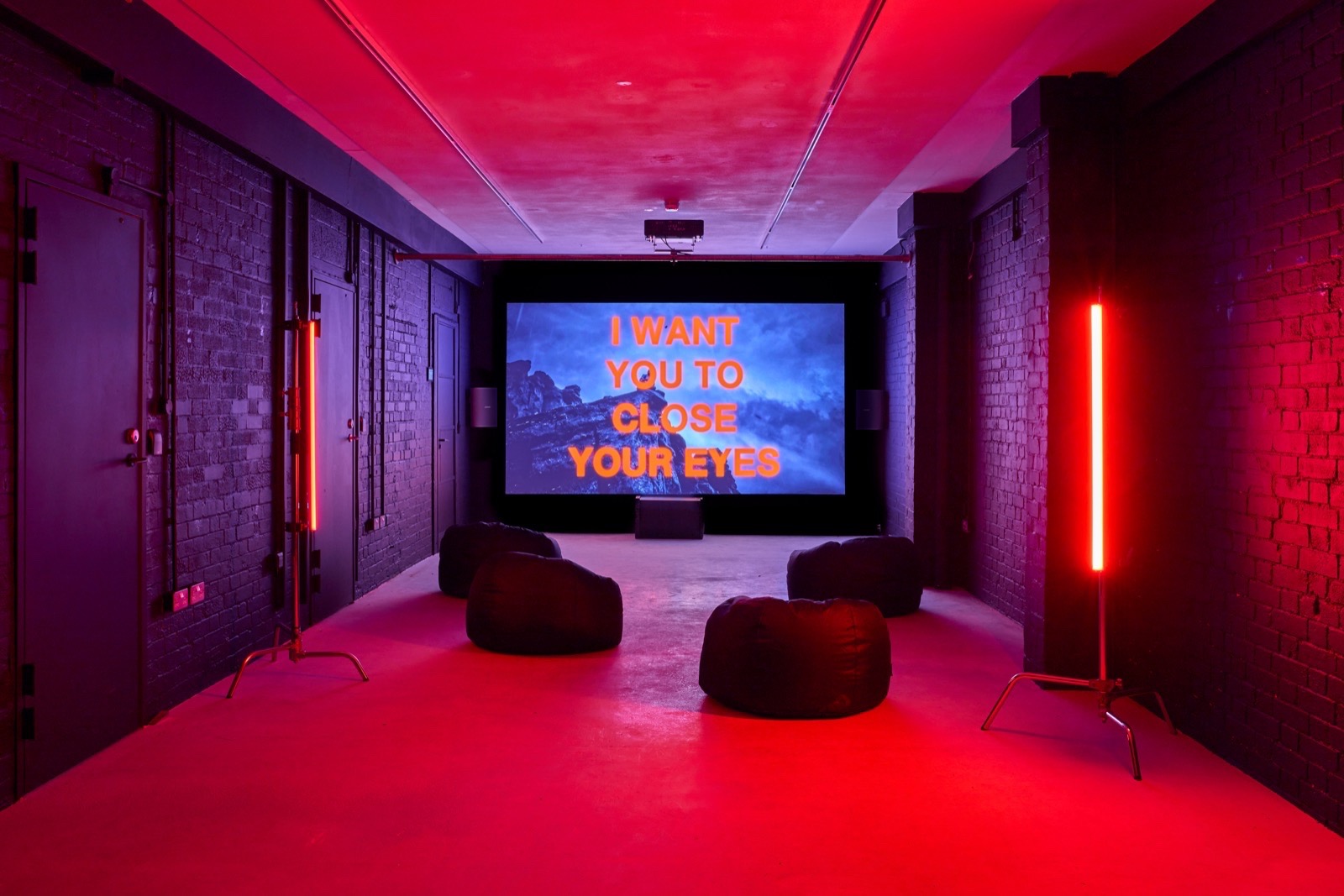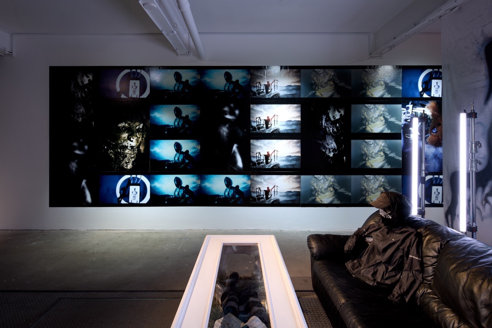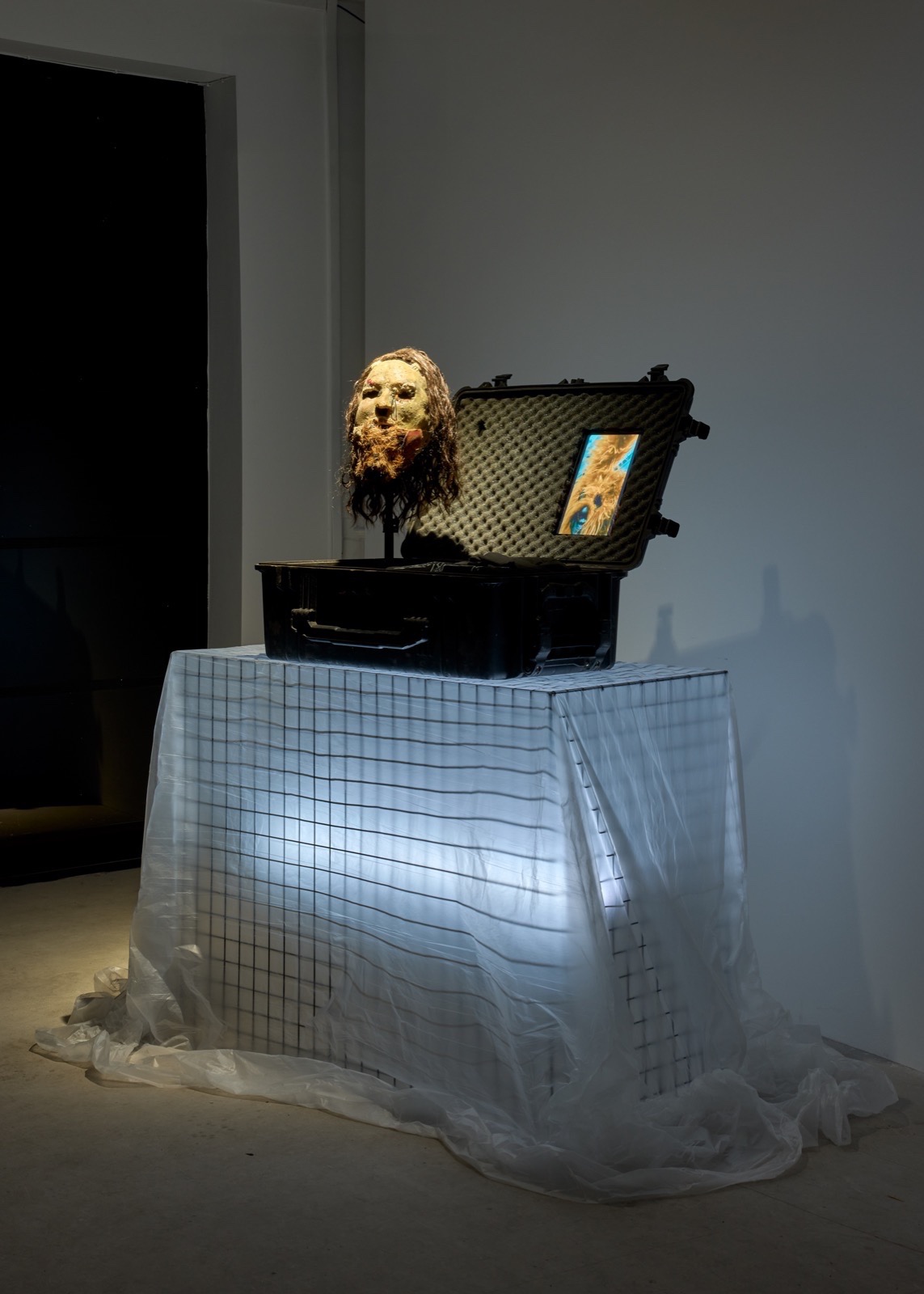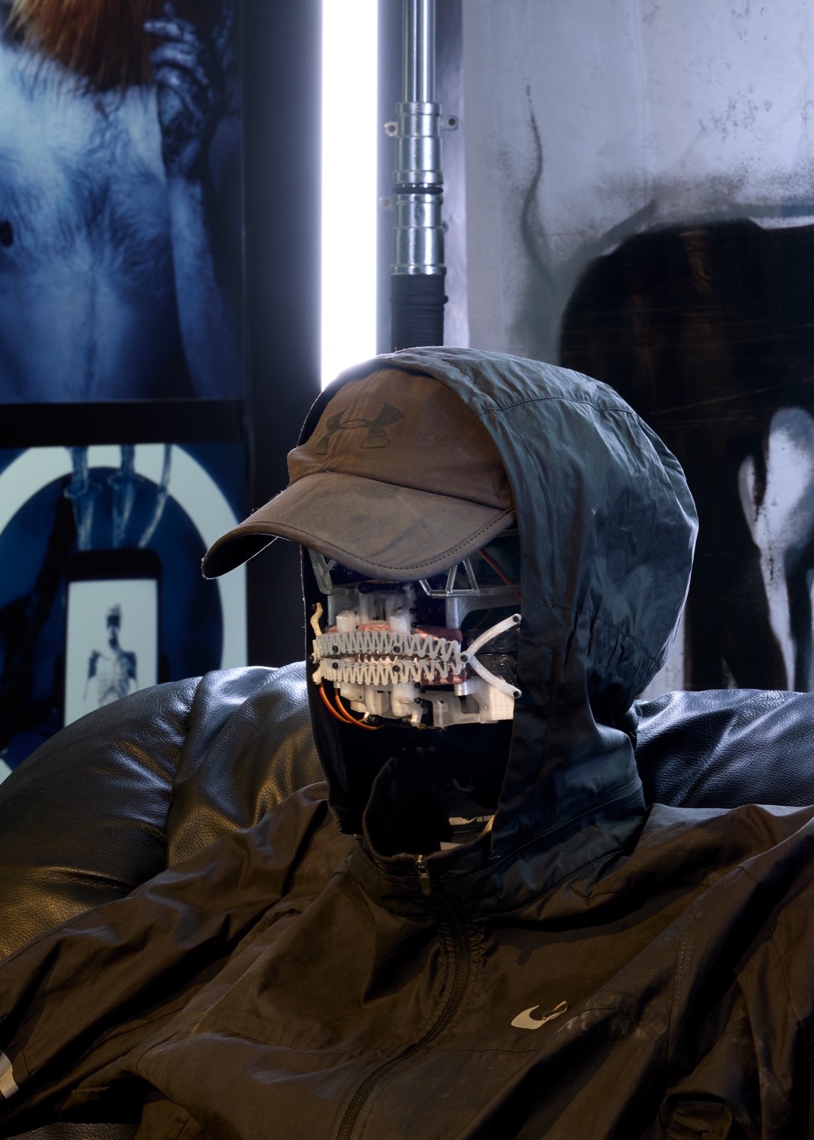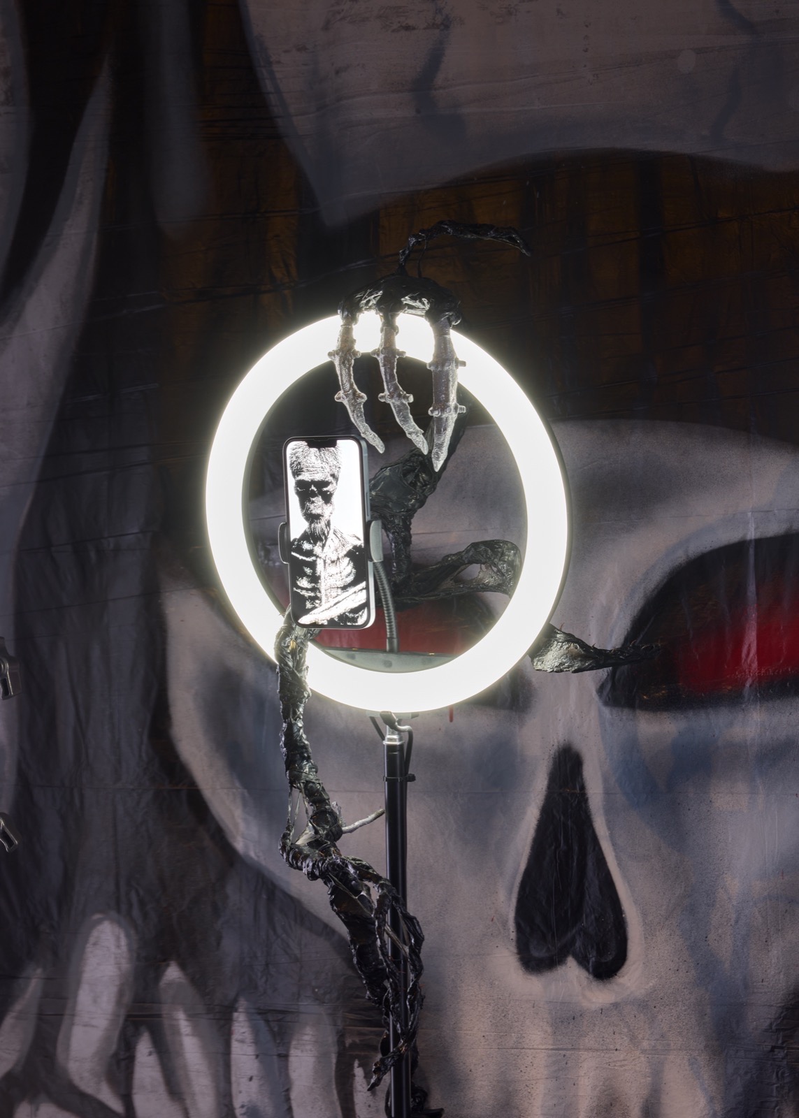 Inside a cave, a decaying skeleton is deep in conversation with a strange looking robot with visible gears in its head, dressed in activewear. “Submit to the singularity”. It goes black and “The sound of something unnecessary intensifies”. PVC clad women in a streaming studio sit between a man in an animal mask: “I love you, but what foxhole are you running?” One of them demands as he then climbs into a box. “Go to your cell, your cell will teach you everything”. The livestream of a man in a rabbit mask segues into a manic preacher in a decaying cloth mask in a darkened room, frantically delivering a sermon. We zoom out again as the original skeleton, a bog body, traverses a harsh but beautiful natural landscape across cliffs and hillside to the sound of discordant guitar. This loops back to the beginning. Where are we? The beauty of this world that’s been created is you can feel your way through it and arrive at your own meaning. The characters from the middle section feels like a cycle of content that’s being made but constantly degrading from some strange source, framed by the skeleton representing humanity being replaced by the robot.