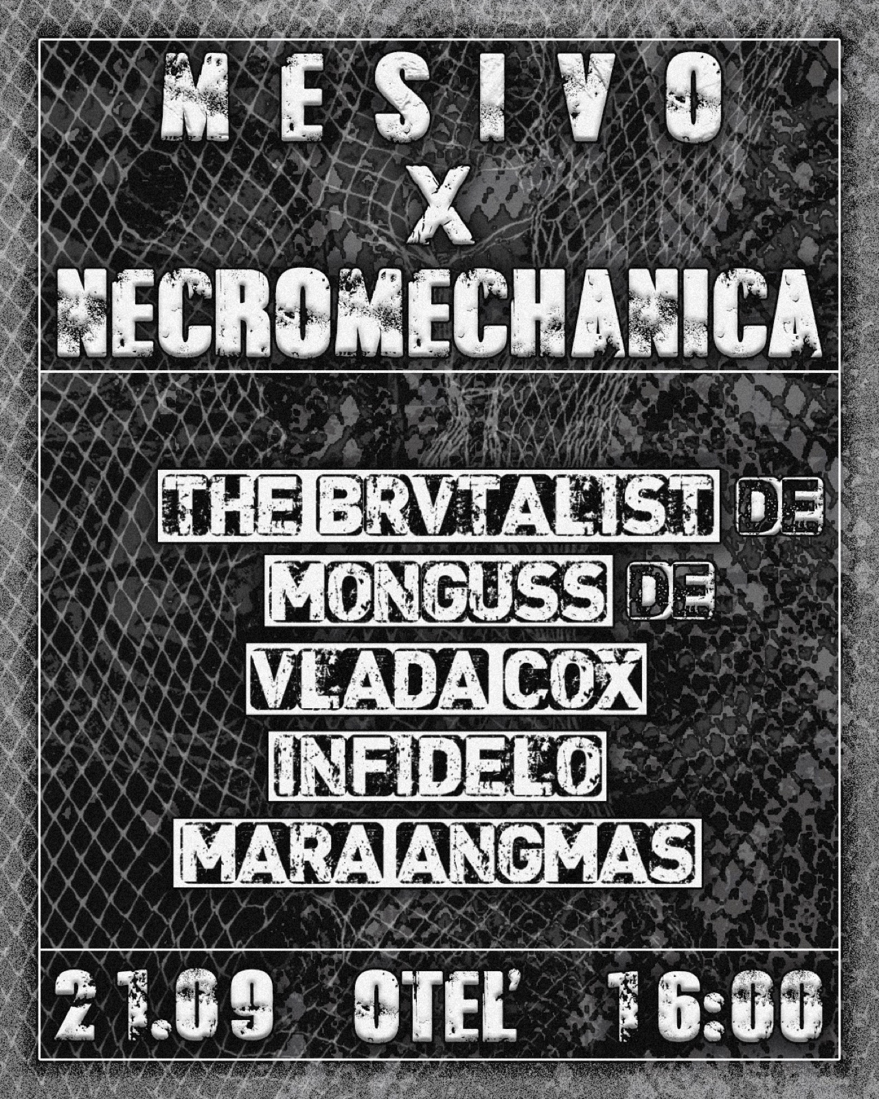 The event MESIVO (IL) X NECROMECHANICA (UA) unfolds as a layered, symbiotic dialogue: a rhythmical oscillation between EBM, electro, broken beat, and house, punctuated by performative interventions that fracture and reassemble tempo itself. The Brvtalist opens with an open-genre set, followed by MONGUSS (DE), a Berlin-based performer. Vlada herself assumes the role of DJ with her collective Mesivo, before INFIDELO and Mara Angmas close the evening.