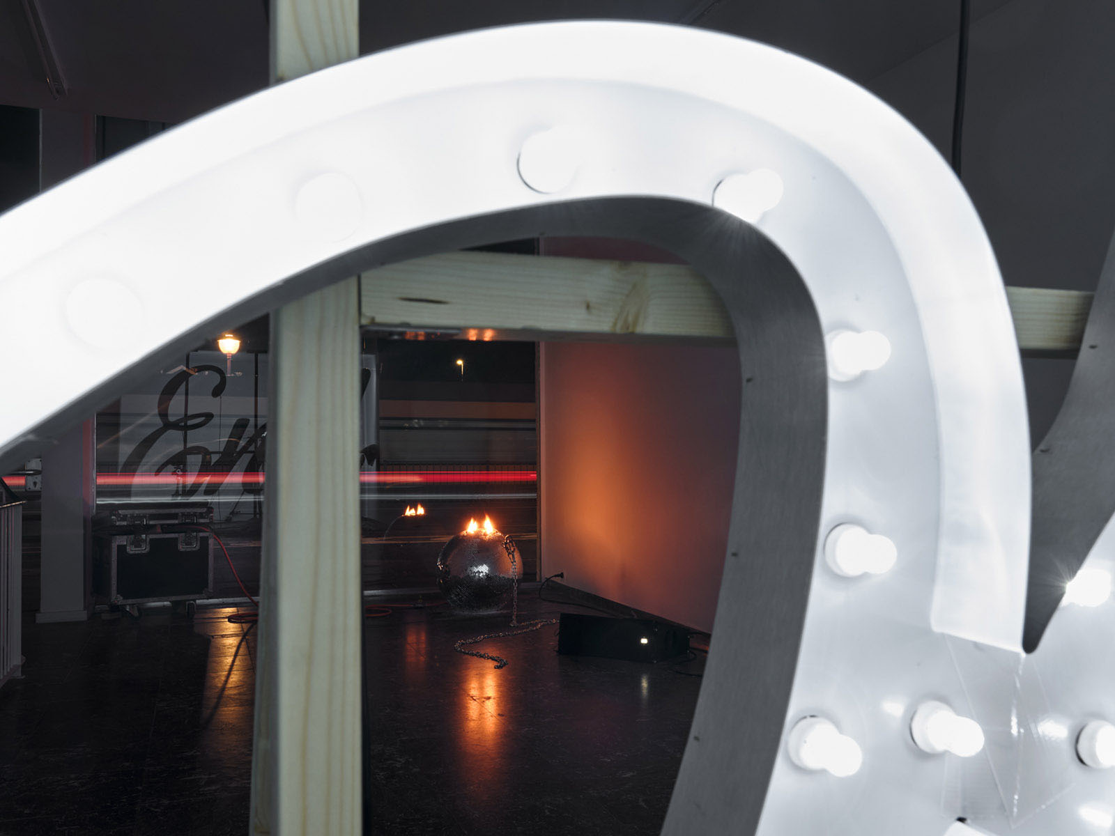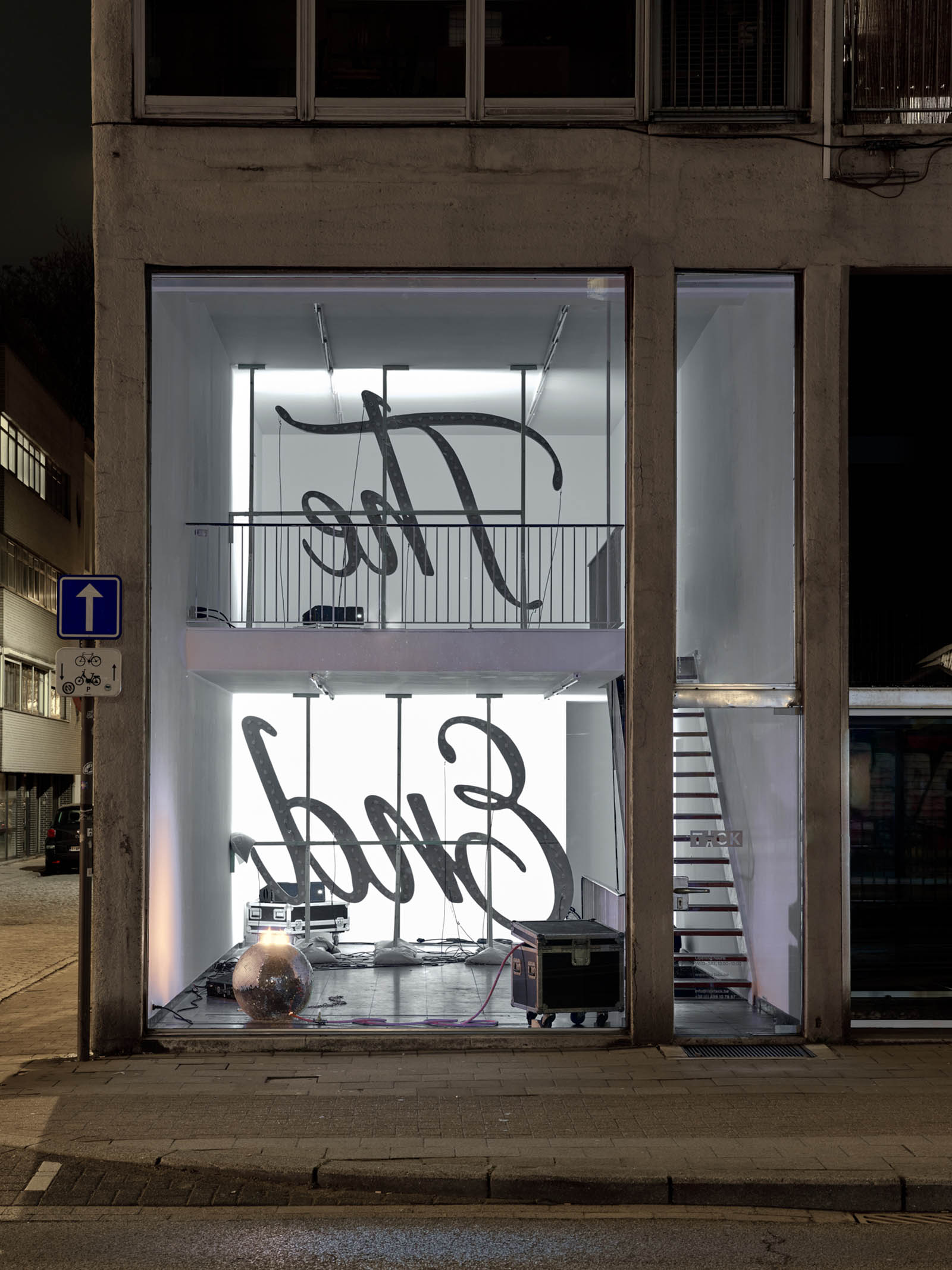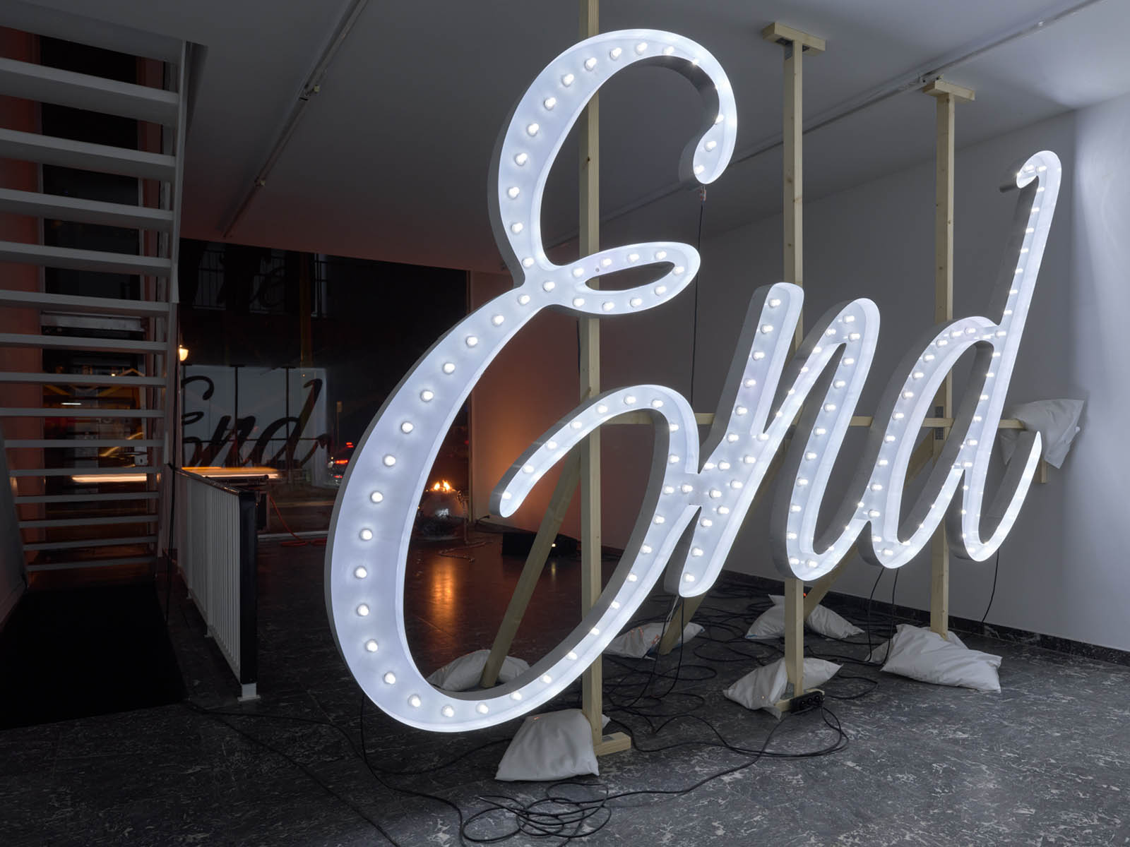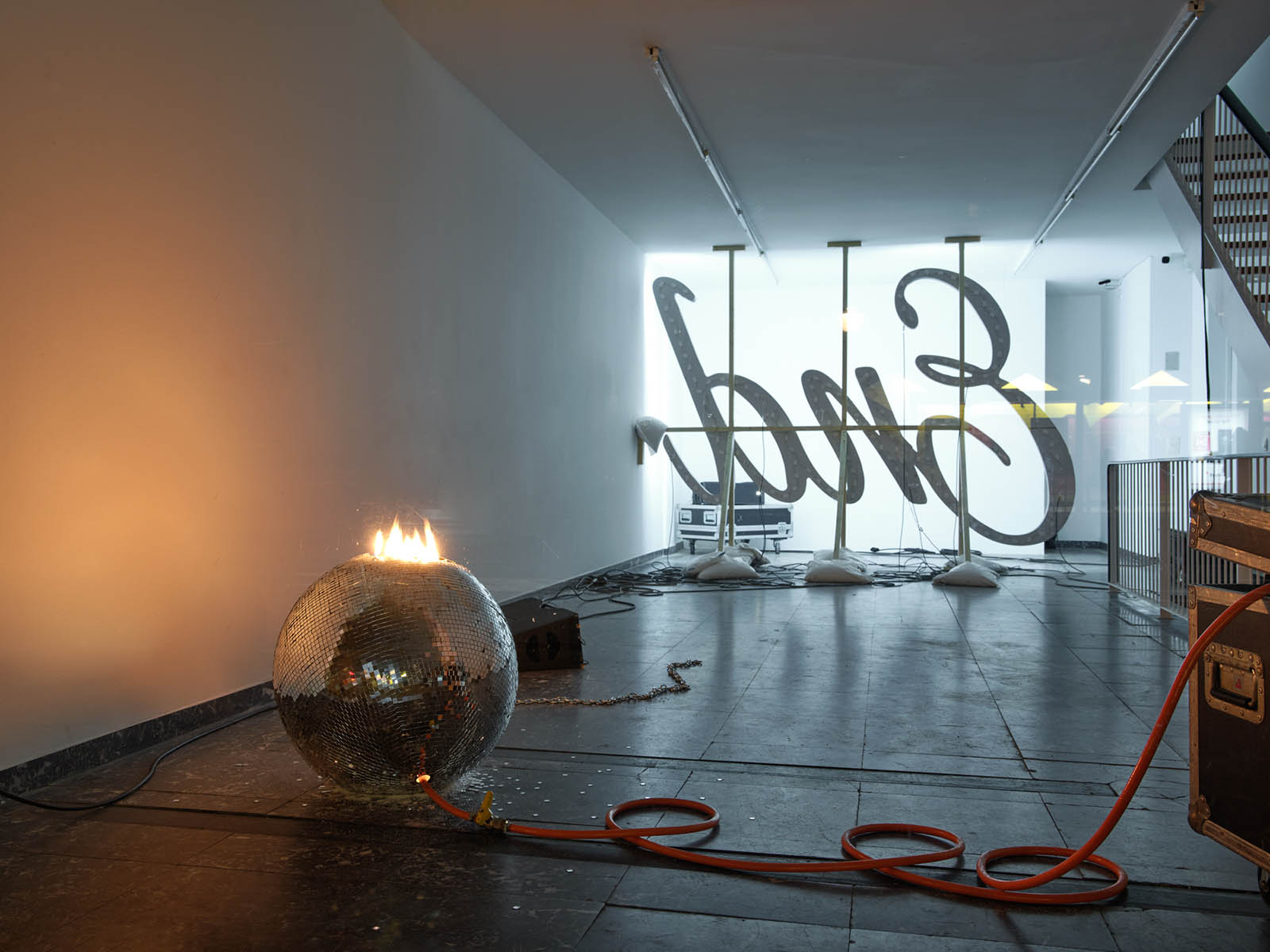 After the initial encounter with the disco ball, it is impossible not to be drawn towards the words The End, fragmented across two levels of the gallery: the ground floor and the upper mezzanine. Its typeface, so close to the end credits of films from the silver screen era, merges with luminous cues that evoke the dreamlike allure of Las Vegas, yet here they are cold, turned towards the wall, as if the spectacle and the frenetic pace of consumption they reference had been abruptly paused. A collective tragedy folds in on itself, bending towards the weight of a personal one.