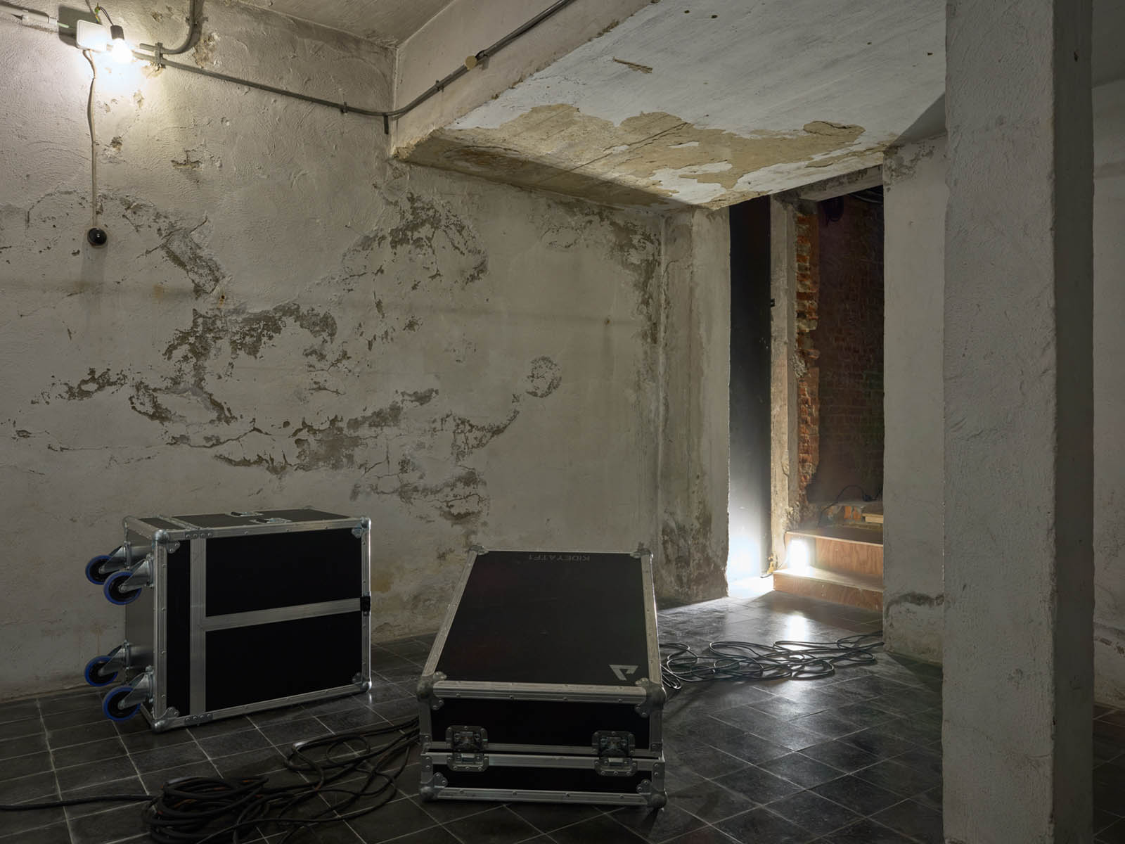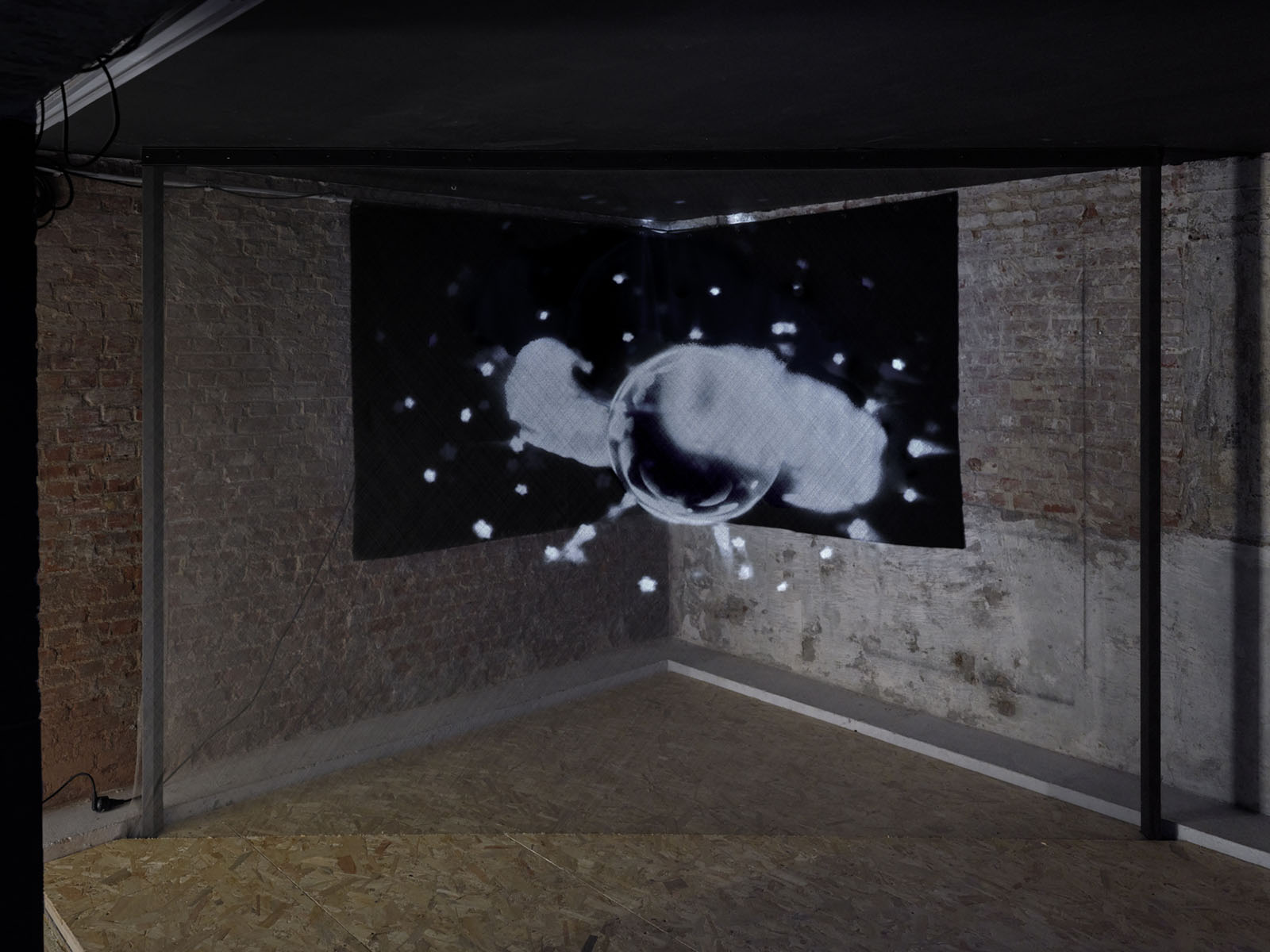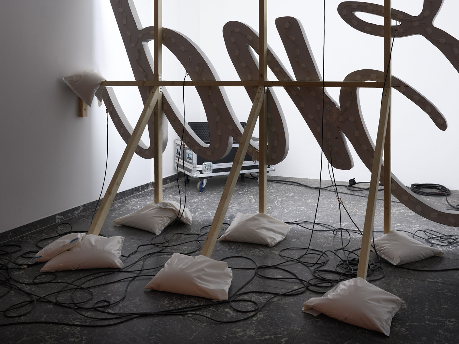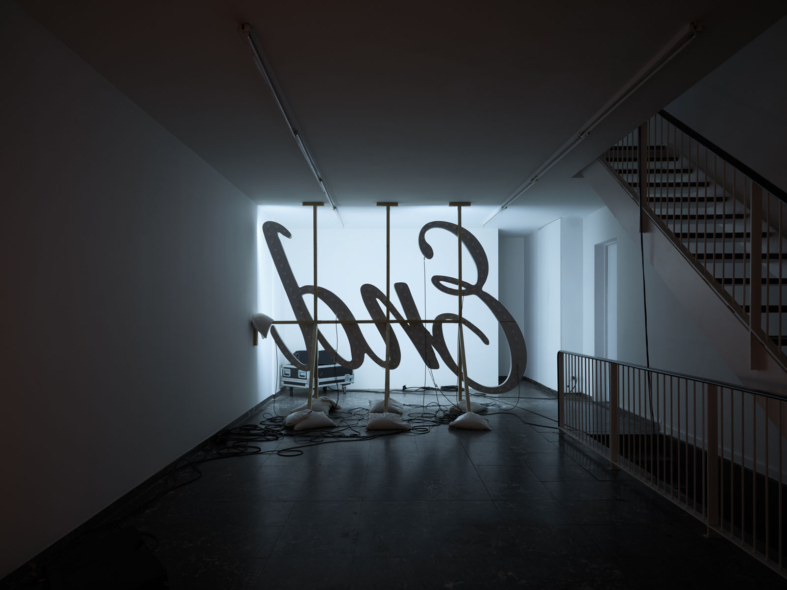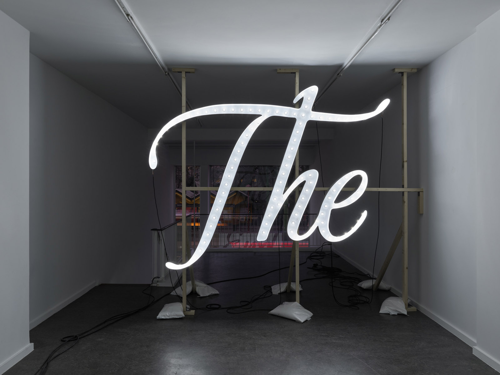 After the initial encounter with the disco ball, it is impossible not to be drawn towards the words The End, fragmented across two levels of the gallery: the ground floor and the upper mezzanine. Its typeface, so close to the end credits of films from the silver screen era, merges with luminous cues that evoke the dreamlike allure of Las Vegas, yet here they are cold, turned towards the wall, as if the spectacle and the frenetic pace of consumption they reference had been abruptly paused. A collective tragedy folds in on itself, bending towards the weight of a personal one.