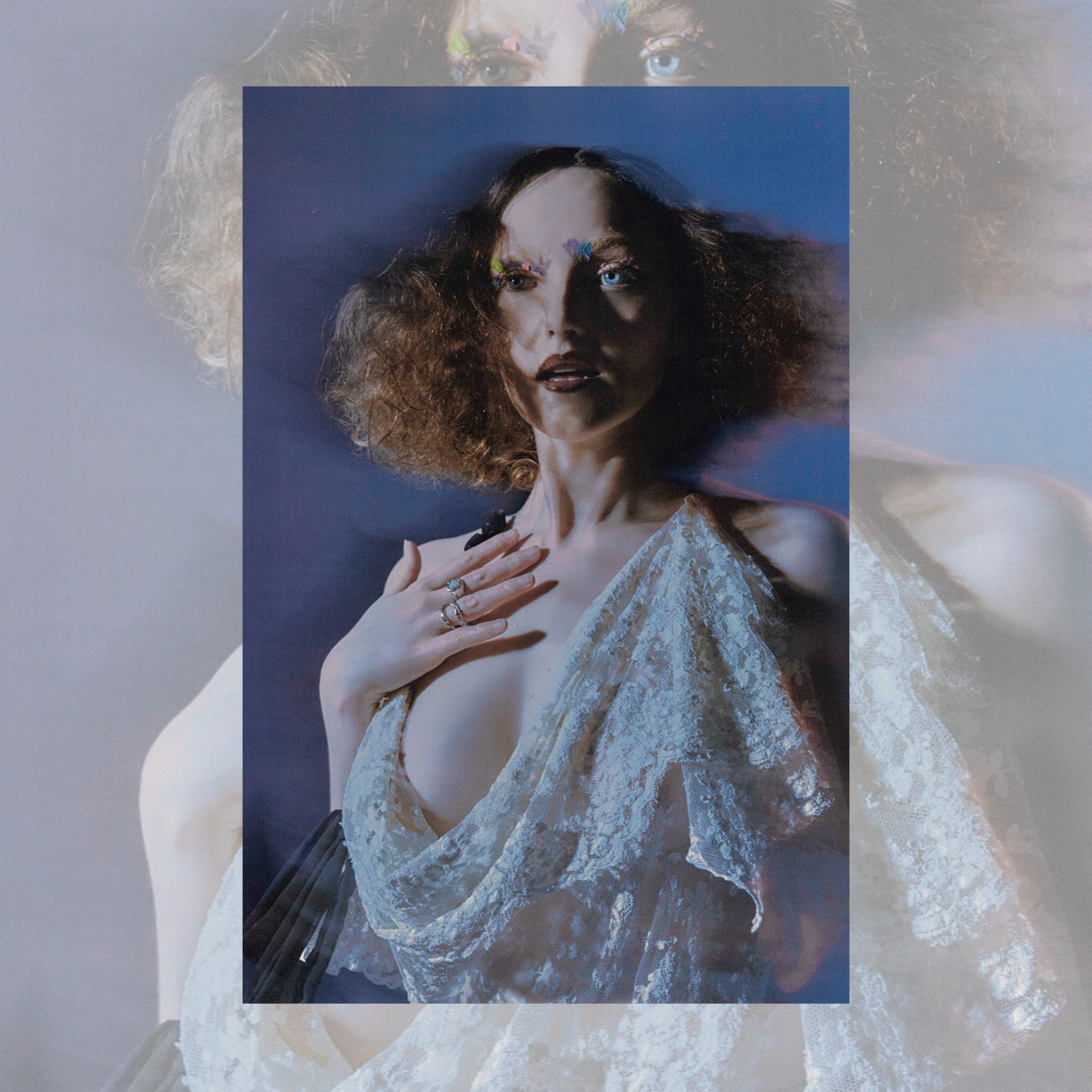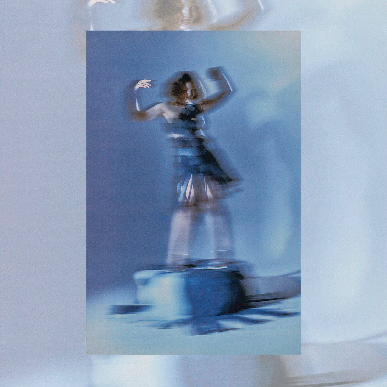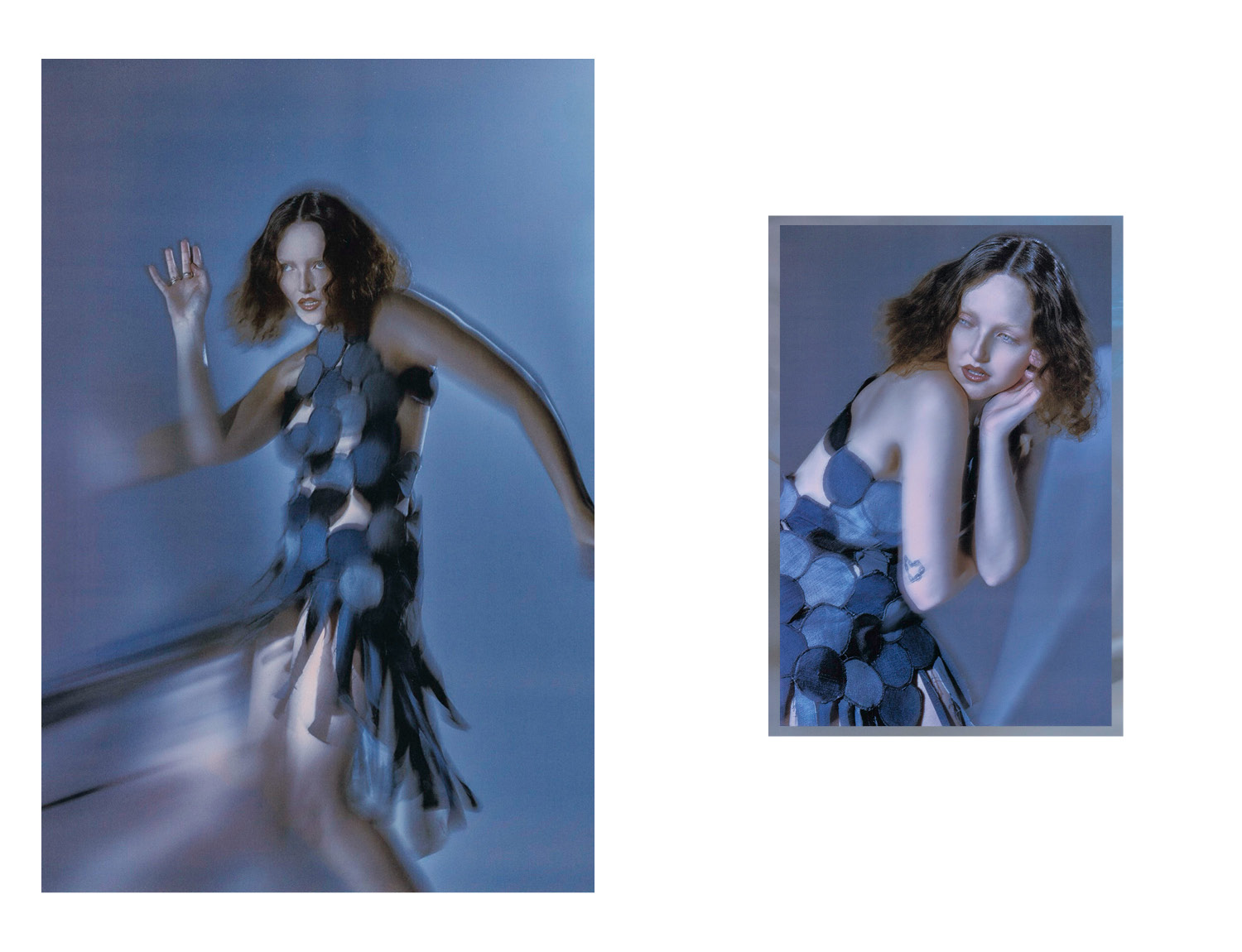 Soft blue haze moves across each frame, pulling into a world where motion blurs and shadows soften every contour. Dark, unfocused tones distort, creating images that linger like fading impressions. Photographed by James Morris.