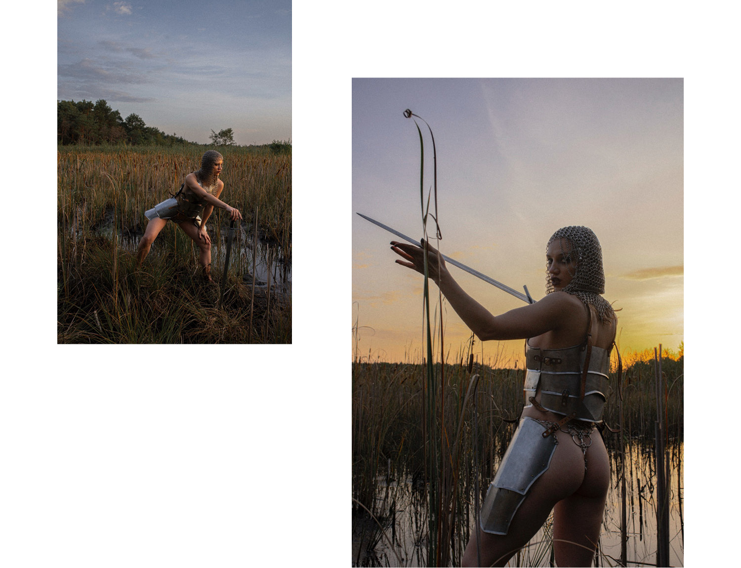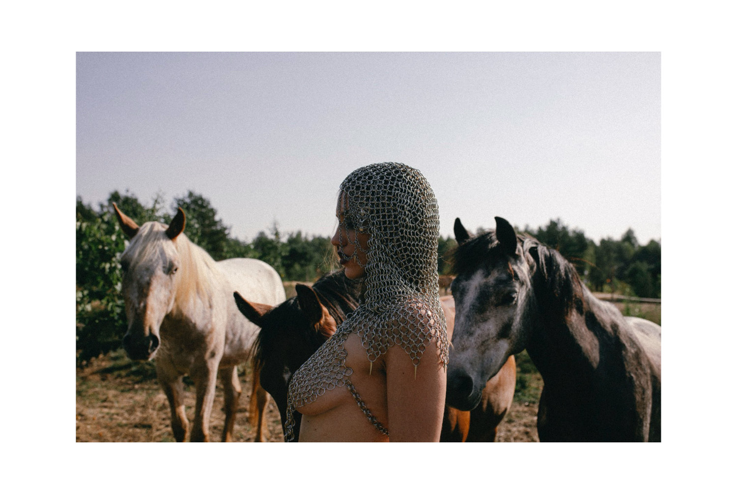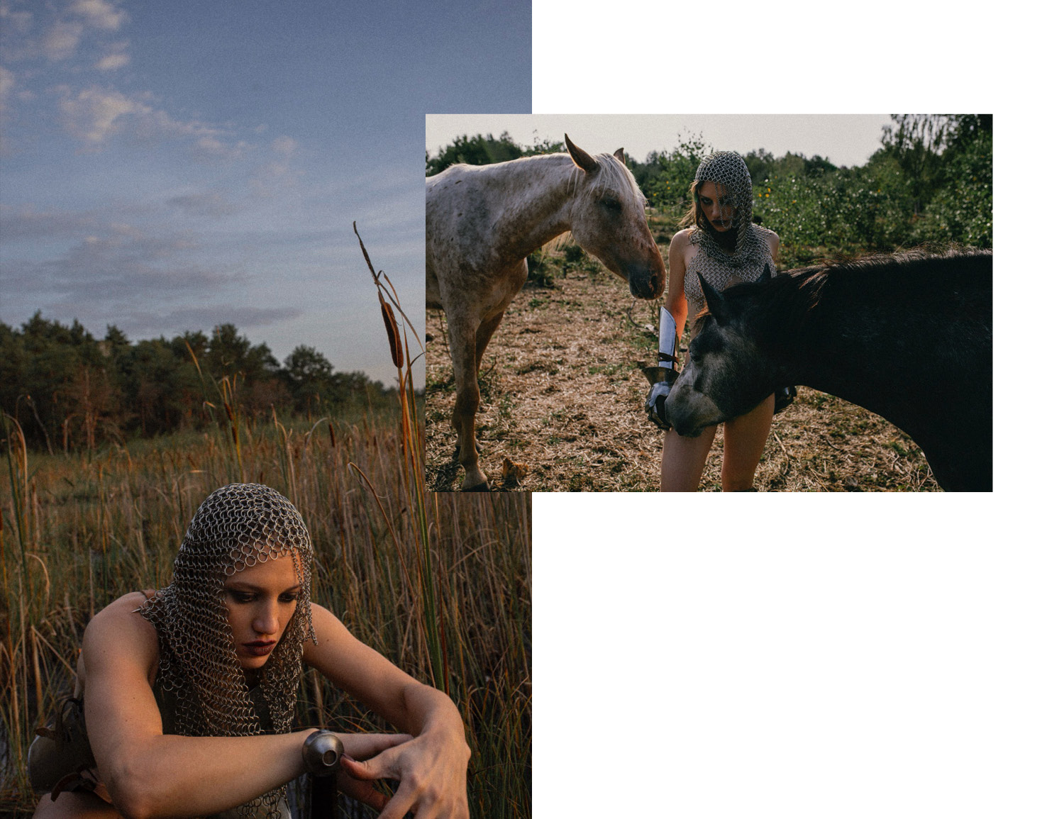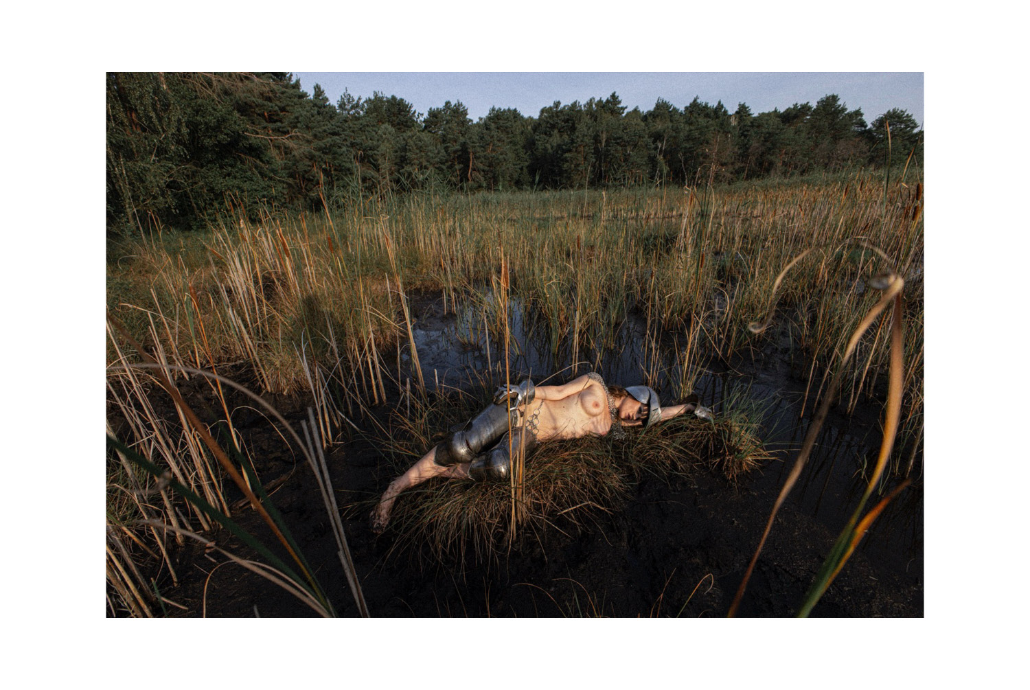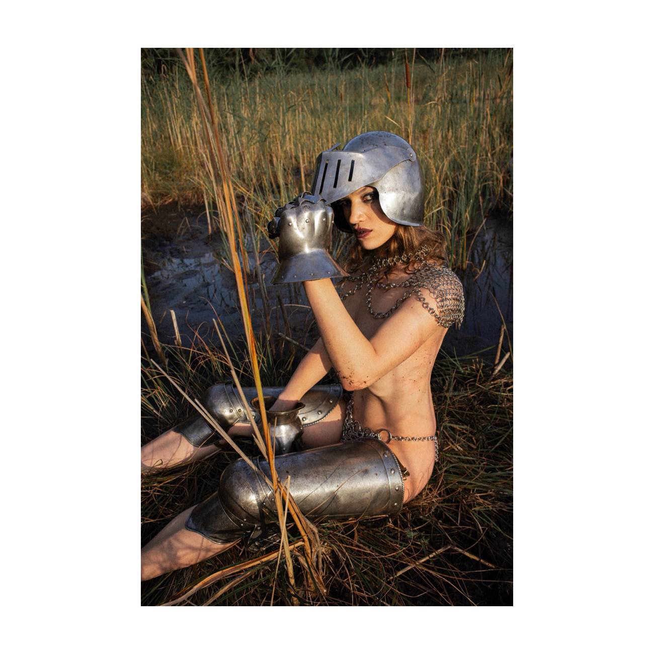 Metal against skin, dusk against breath. A body caught between myth and earth, neither hero nor ghost. The field holds its silence, as if waiting for something to begin. A series by Helena Bromboszcz.