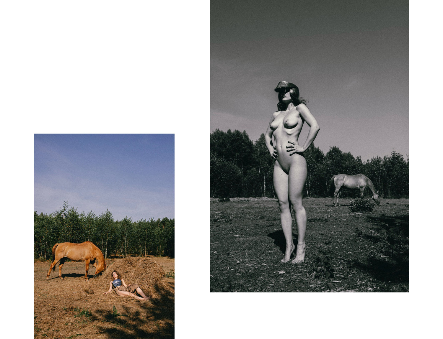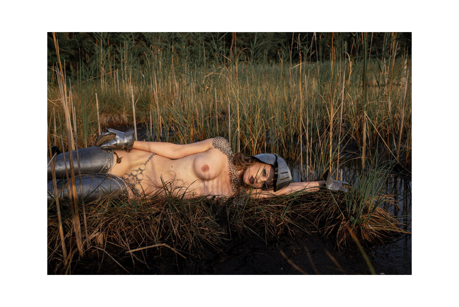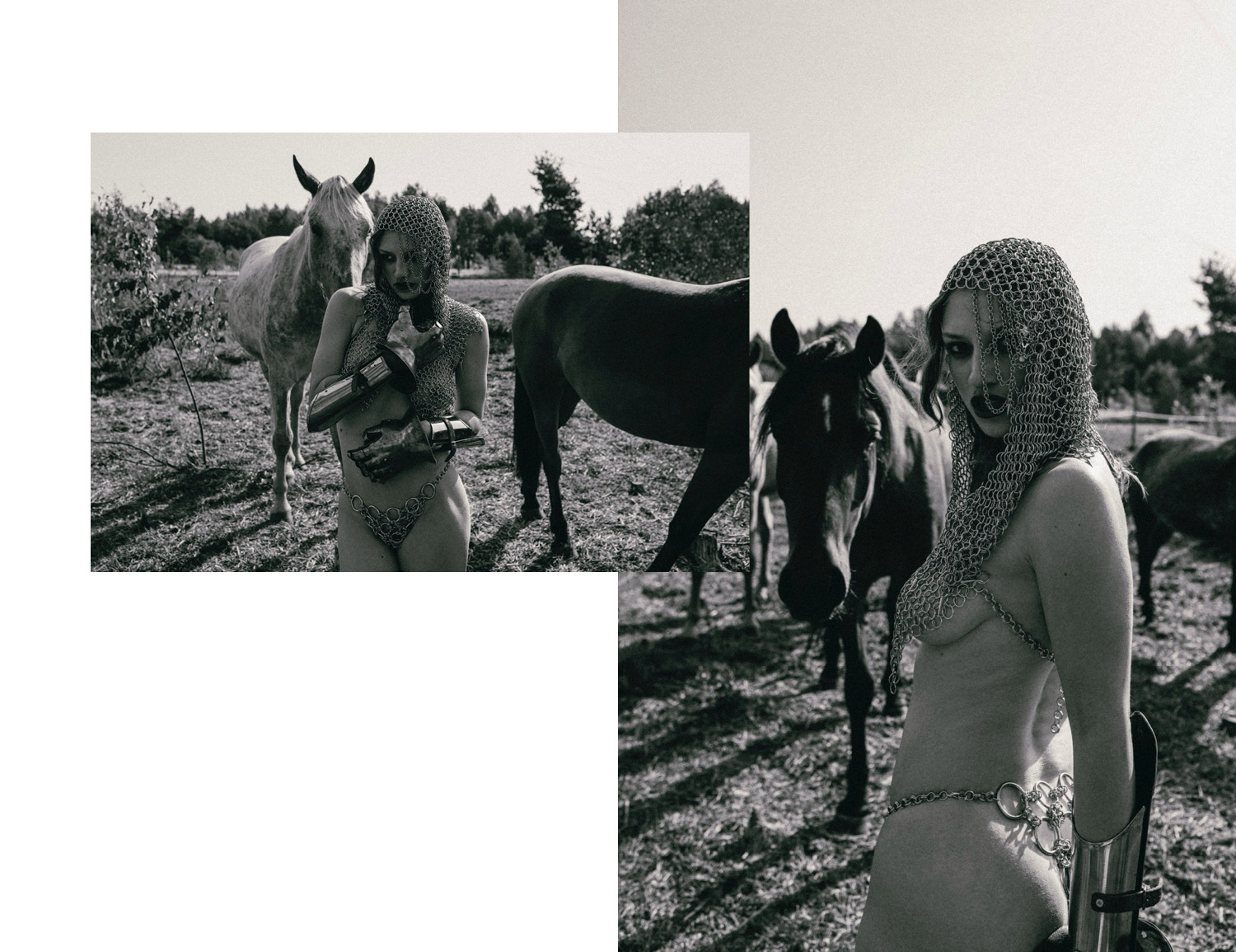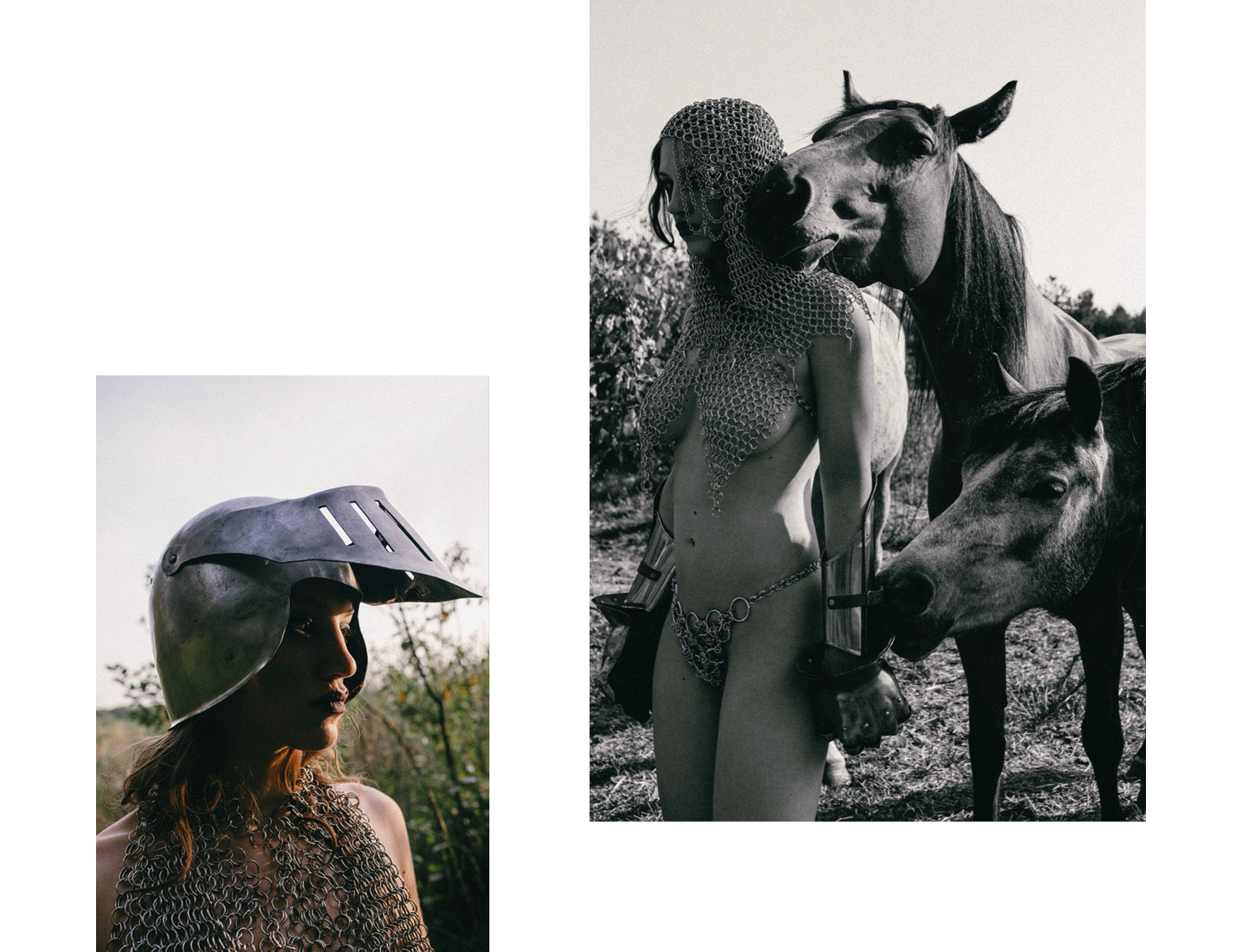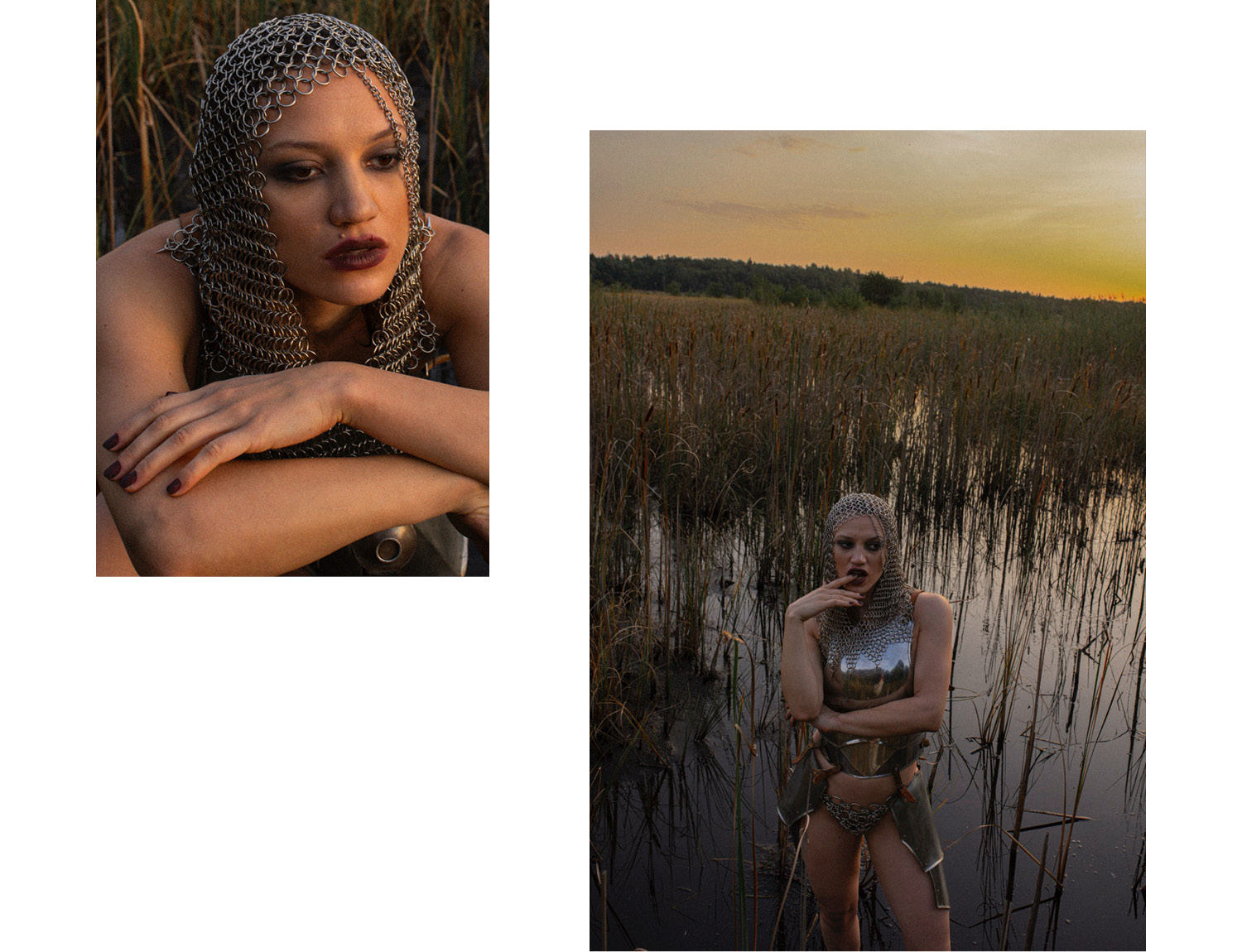 Metal against skin, dusk against breath. A body caught between myth and earth, neither hero nor ghost. The field holds its silence, as if waiting for something to begin. A series by Helena Bromboszcz.