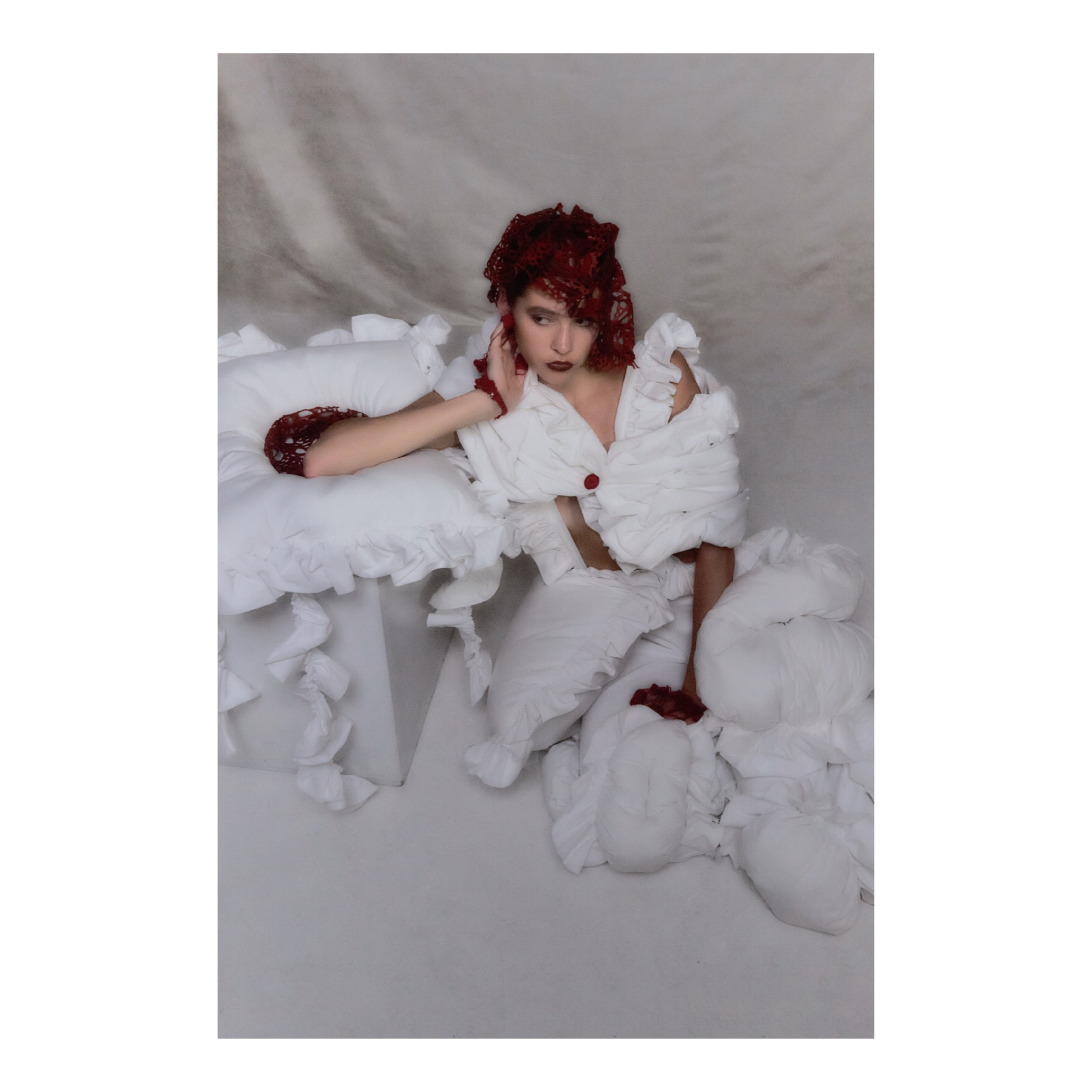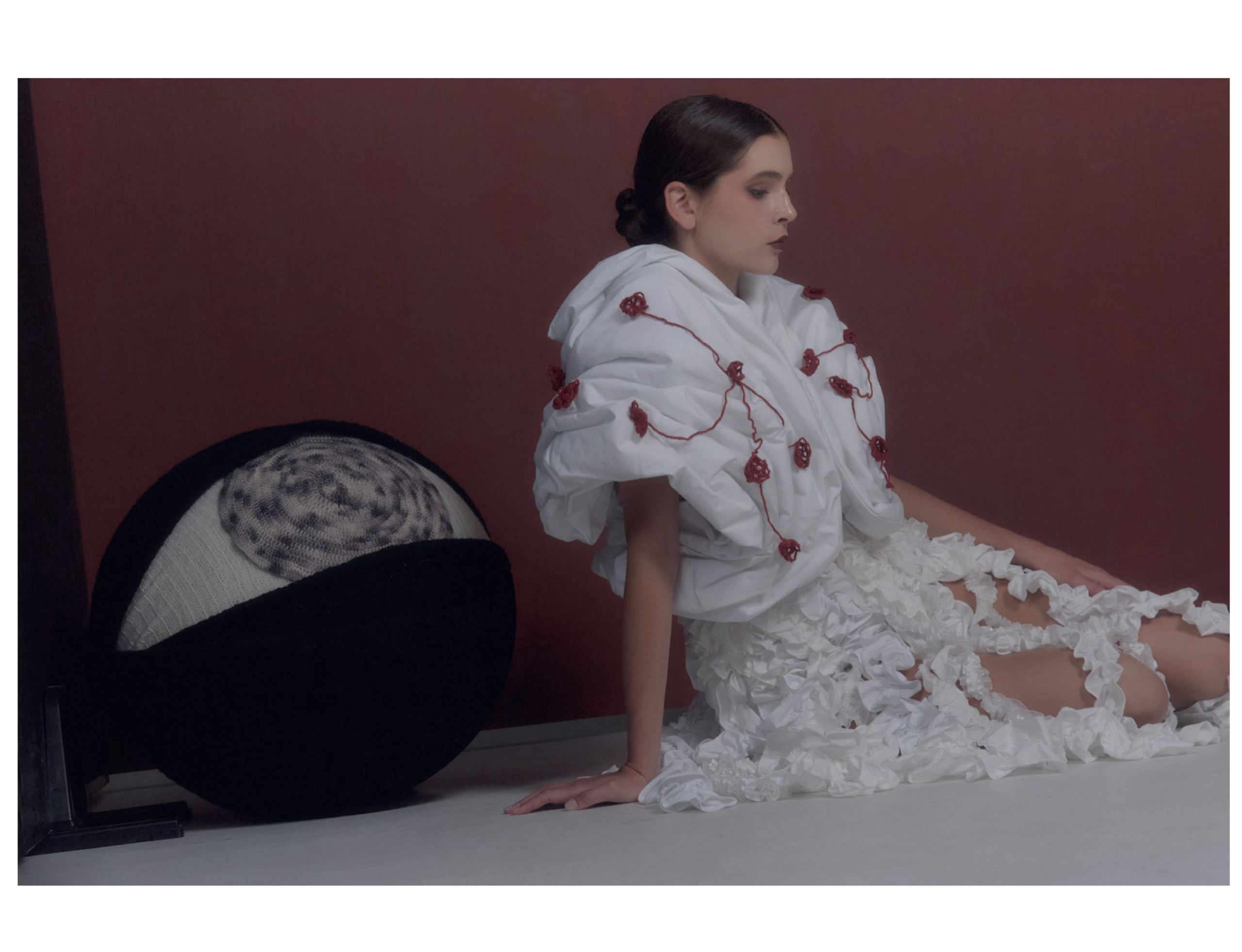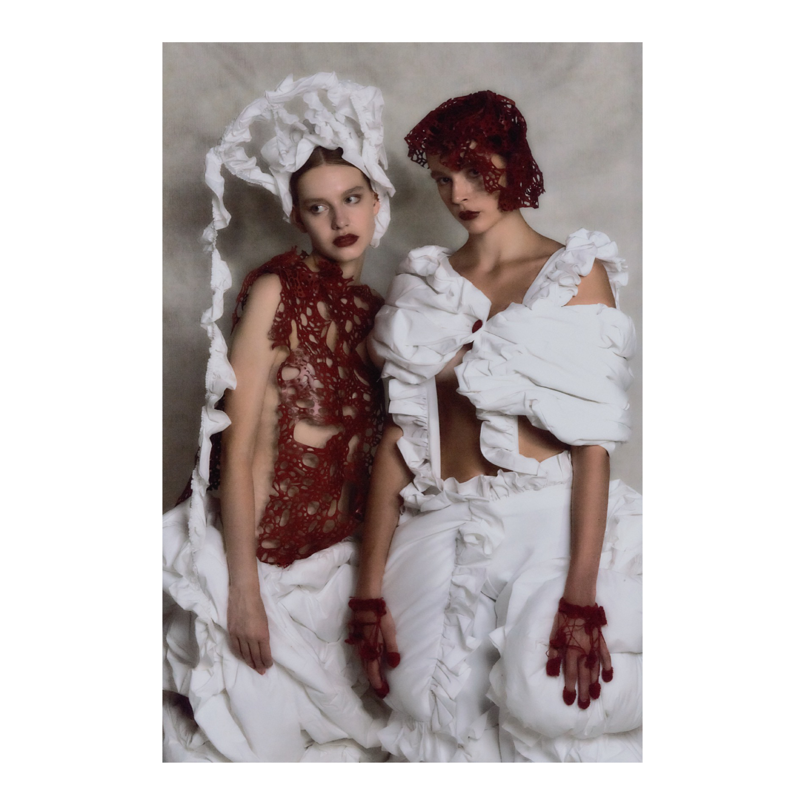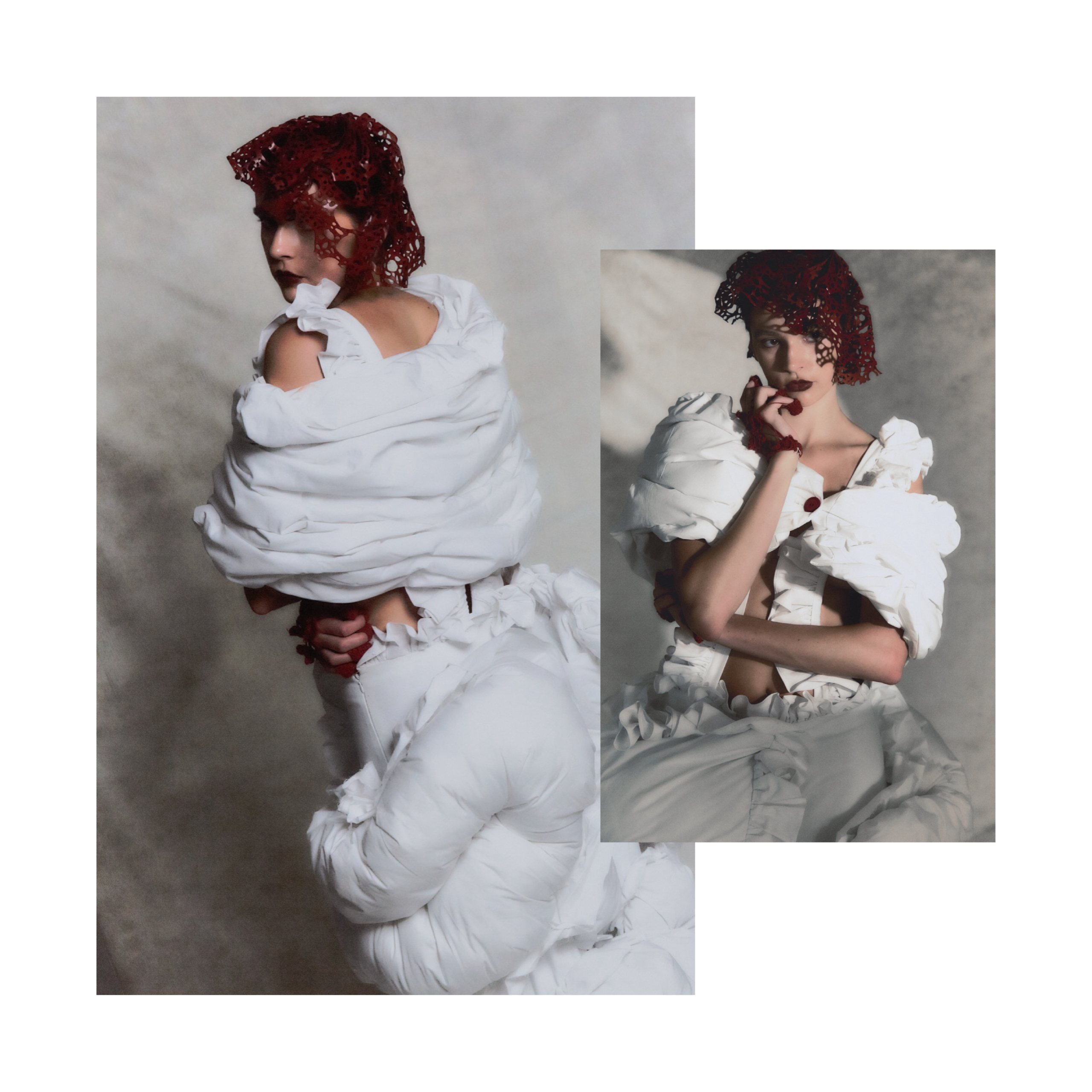 Felting is central to my practice. I love that it sits between control and surrender. Fibers tangle, compress, and become a new surface, and that transformation mirrors the way emotions accumulate, blur, and harden over time. I also use a lot of boning as inner structures. Boning gives the silhouette discipline, but it also creates restraint or a sense of containment. That tension is important to me, especially when I think about insomnia as a psychological space.