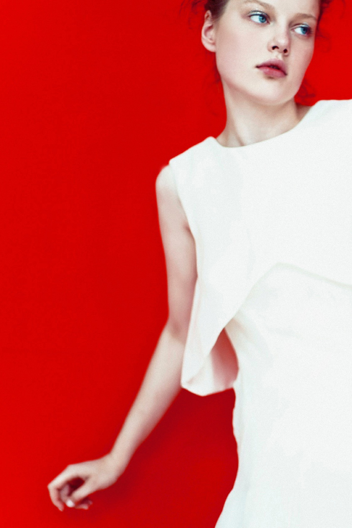 Deep red, white and black in their purest form. This is a clean and powerful fashion story, starring Ksusha photographed by Azahara Fernandez and styled by Marianne Krauss.