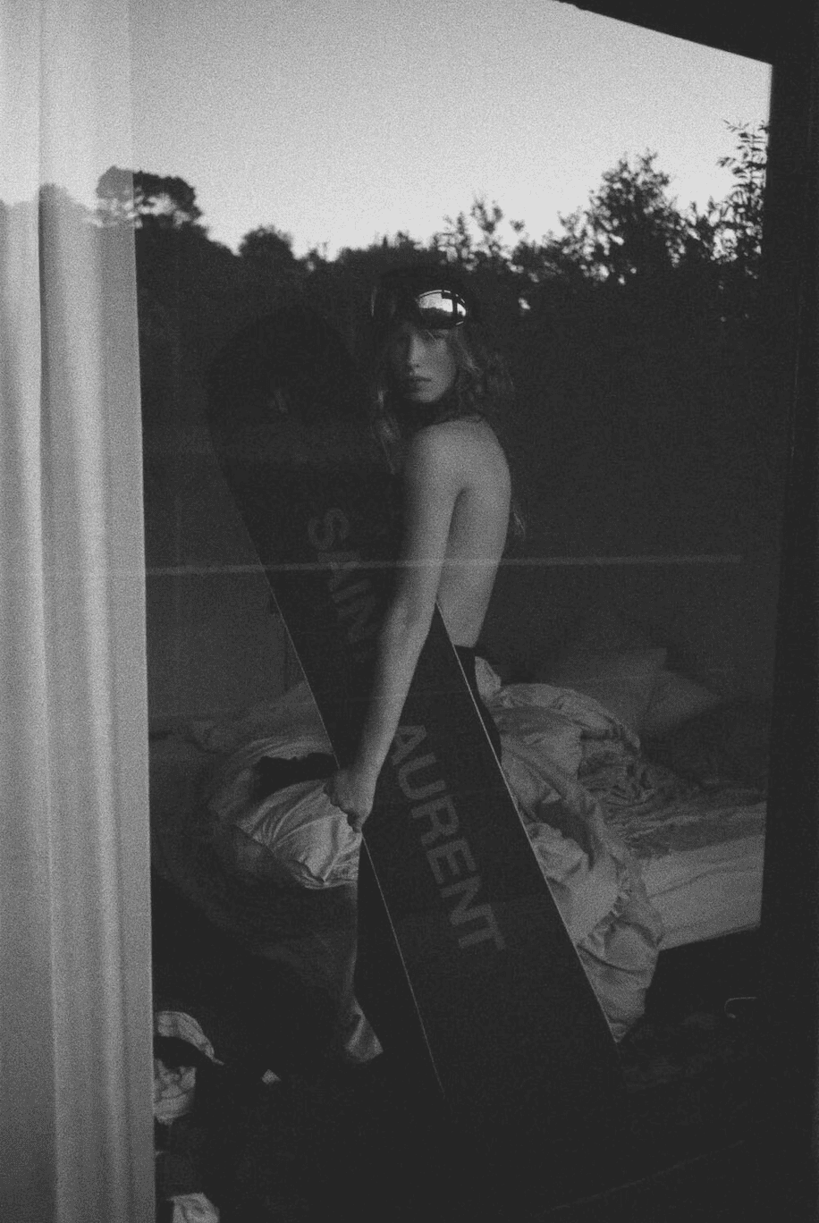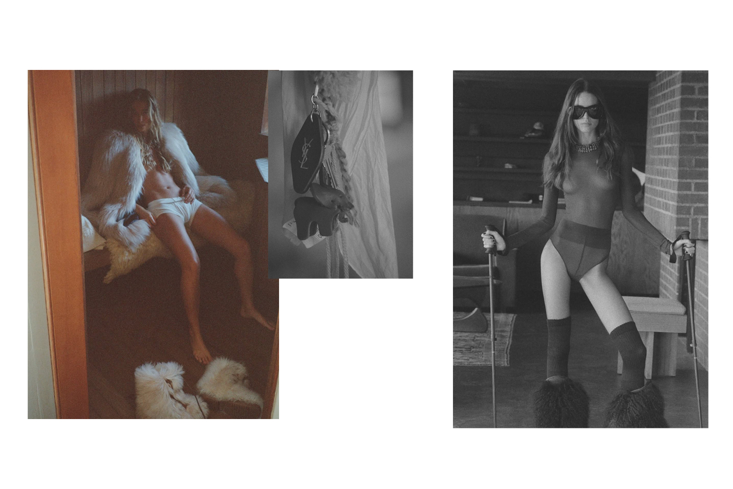 Henrik Purienne captures the collection through moments of waiting and transition rather than performance. His images feel hushed, almost suspended, as if time has slowed along with breath. Figures appear half-dressed, caught between protection and exposure, between interior spaces and the open cold. Padded jackets, helmets, and ski goggles coexist with bare skin, sheer bodysuits, and flashes of near nudity, sometimes interrupted only by a fur coat or a Saint Laurent bag. There is a quiet sensuality running through the images. It lives in the contrast between temperature and touch, in skin exposed to cold air, in fabric brushing the body before it shields it. Desire is suggested rather than staged, emerging through posture, proximity, and the tension between covering and uncovering. Sensuality here is physical, restrained and deeply tied to sensation.