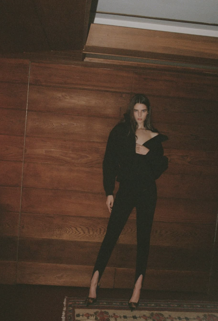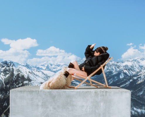 Textures take on a heightened presence. Matte black fabric against pale snow. Fur brushing skin. The soft resistance of down next to the hard geometry of skis. Light remains diffuse, never sharp, flattening contrast and drawing attention to posture, gesture, and mood. A figure adjusting gloves in low light feels private. A body stretched across a bed with equipment nearby reads like a moment stolen before going back outside. The body is never fully sheltered, never entirely exposed. Luxury appears precisely in this tension, not as display but as proximity to the elements.