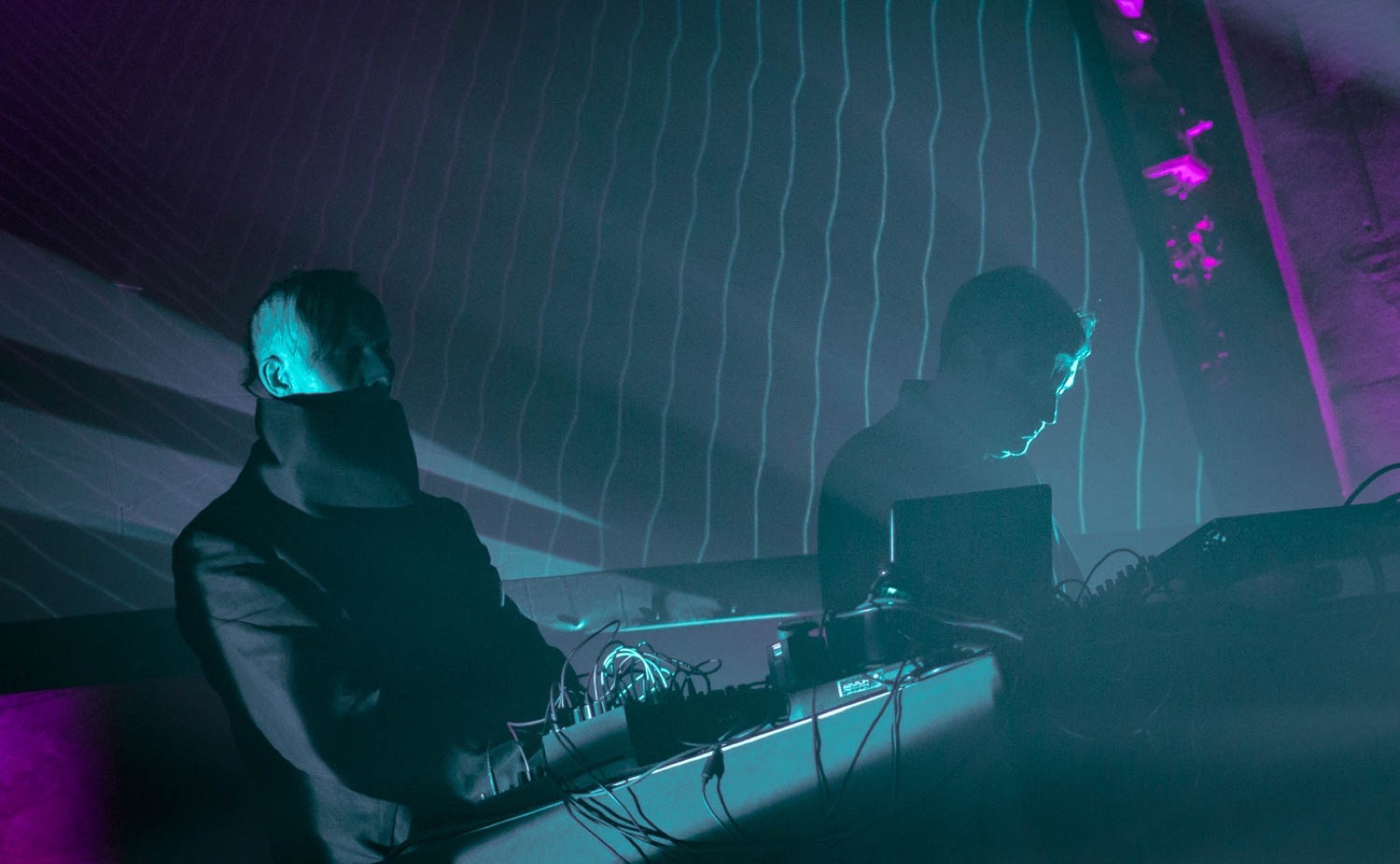 Loscil and Lawrence English take to the stage clad in black and bathed in light like 2 audio monks. Loscil favouring a simple utilitarian black shirt and English ensconced in a black futuristic jacket that masks the entire lower half of his face.