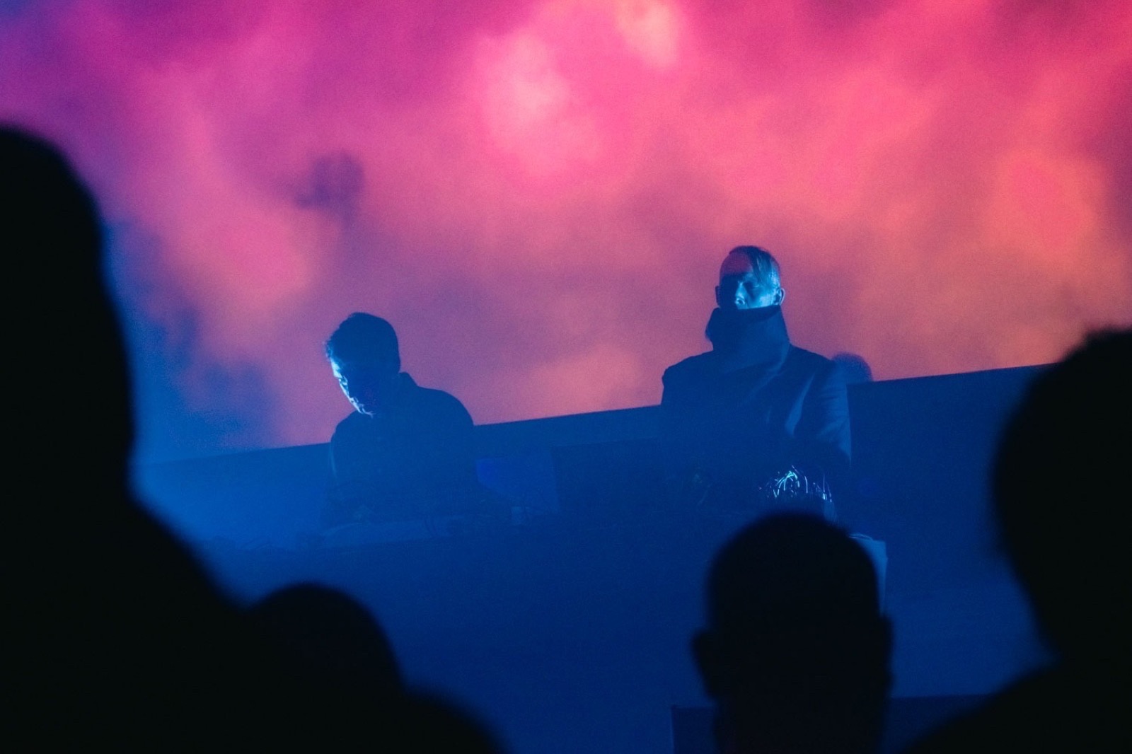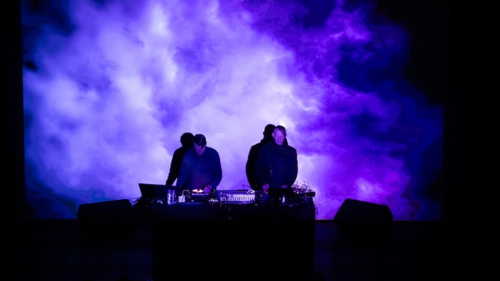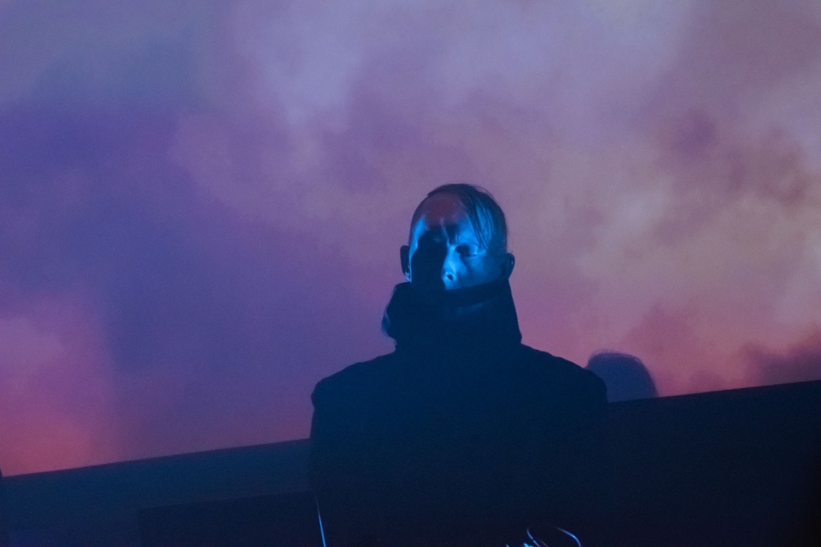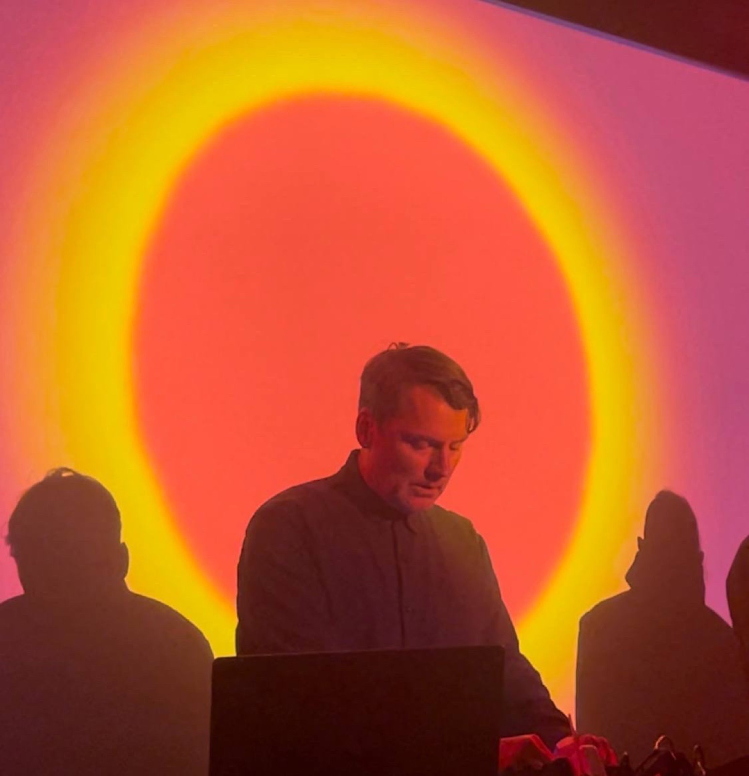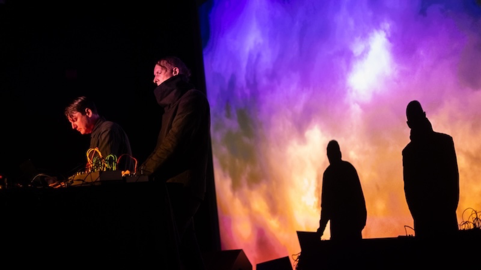 The set begins gently with “Cyan” and “Aqua”. It evokes the beauty and self-generative natural world with its accompanying sunrise backdrop. There is an ethereal synth punctuated by keys that sound like raindrops pattering. Audience in awe. They play with the ordering of the album. “Violet” follows with an insistent industrial synth flutter underpinned by a ringing gong and ascending keys.