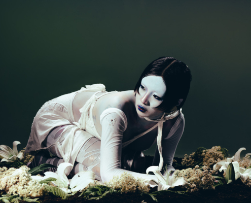 A visual ritual that draws inspiration from "Death" by Melanie Martinez. The body becomes a site of transition marked by signs, fluids, and shifting forms. The imagery translates transformation into a contemporary language, revealing death as a quiet act of regeneration. Photographed by Gioia Perez.
